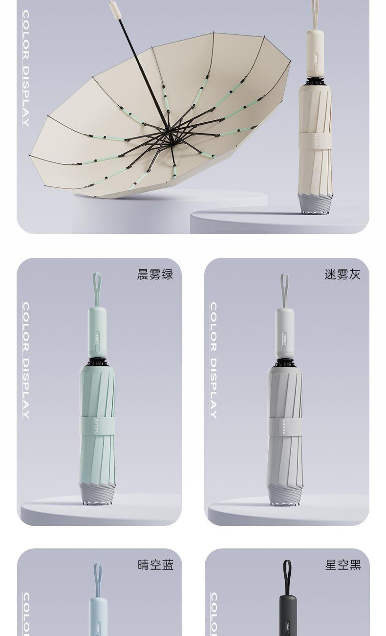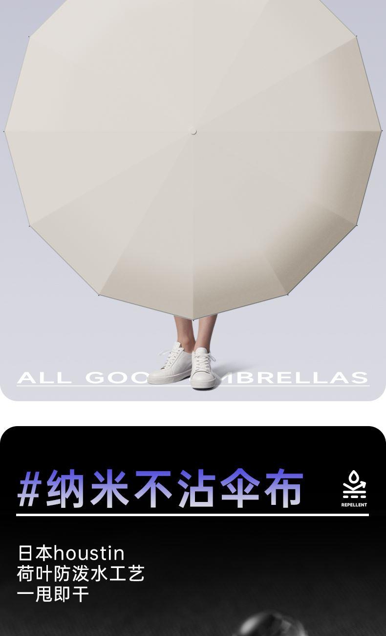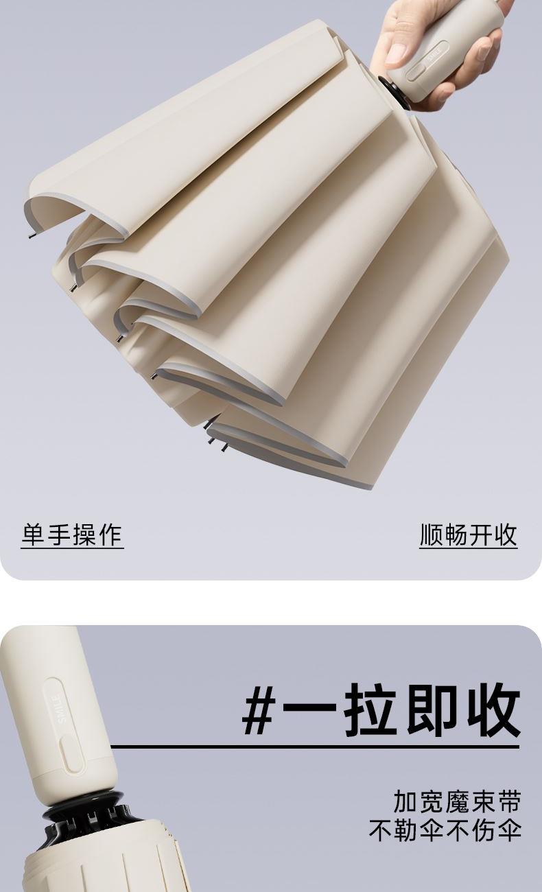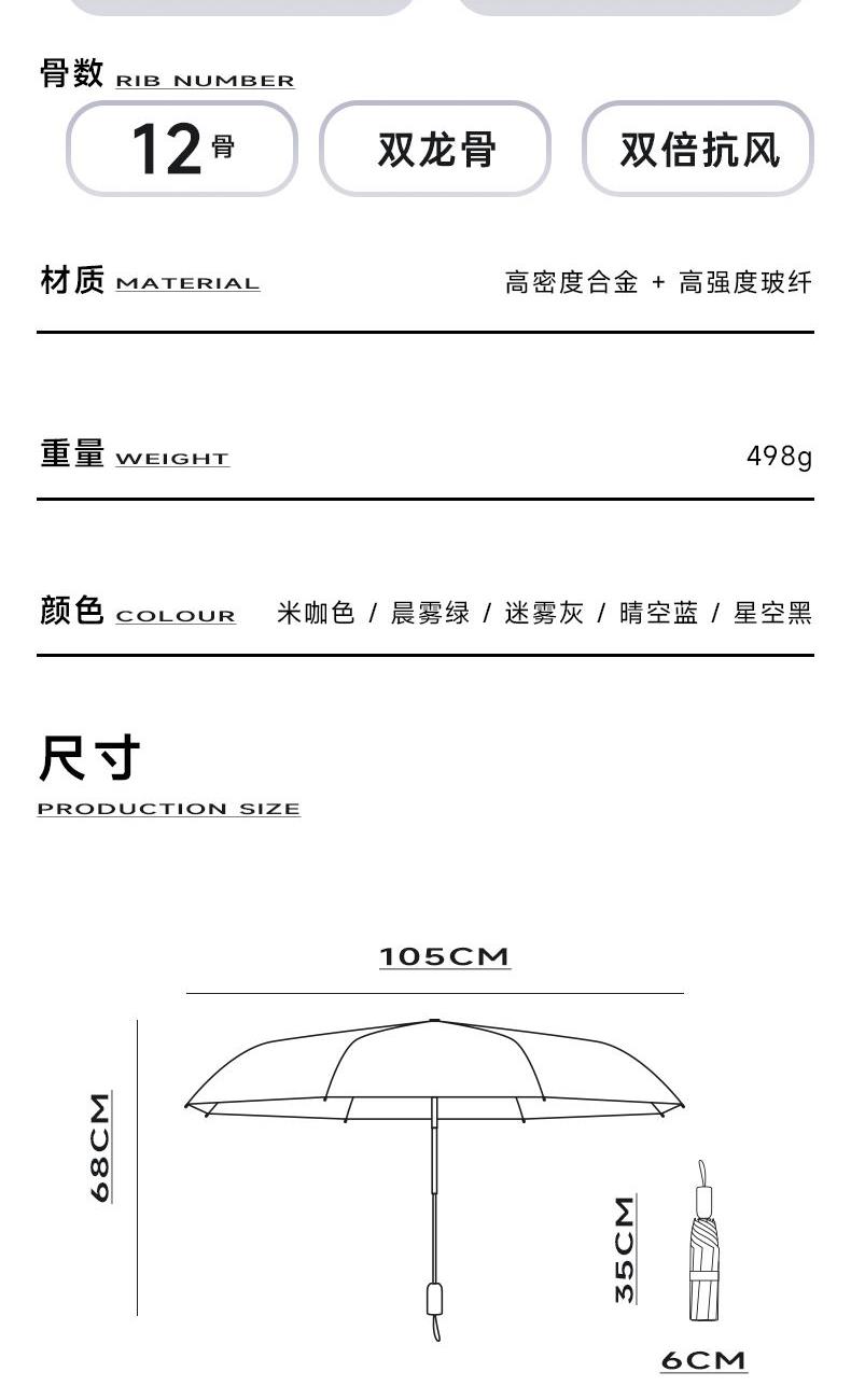 商品货号:ZD191 伞架材质:碳素钢,玻纤 伞面材质:抨击布 款式:自动三折 商品参数:直径:105cm 高度:68cm 收拢直径:6cm 收拢高度:35cm 商品毛重:0.498 商品颜色:米咖色 星空黑 灰绿 浅灰 灰蓝