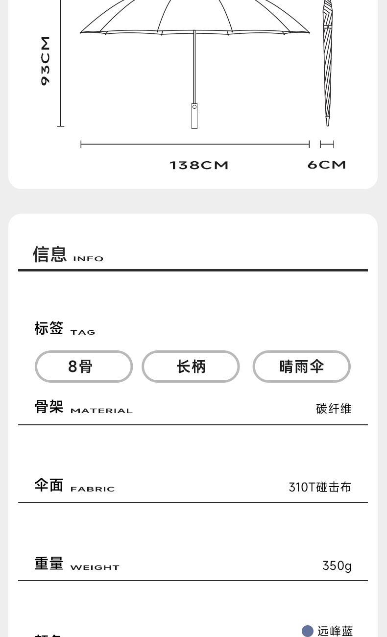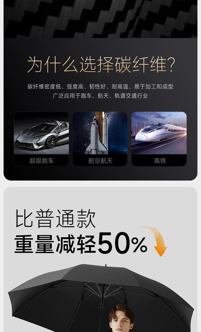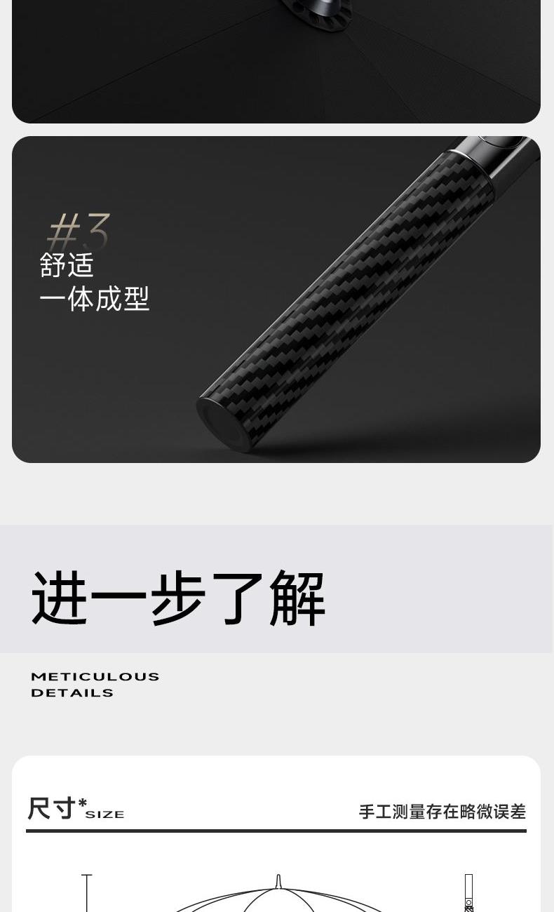 商品货号:ZD075 伞架材质:碳纤维 伞面材质:黑胶布 款式:8K半自动长柄伞 商品参数:直径:120cm 高度:93cm 收拢直径:6cm 收拢高度:93cm 商品毛重:350克 商品颜色:黑色 灰色 蓝色 配置及定制:支持伞面logo定制(具体定制费用高另外核算)