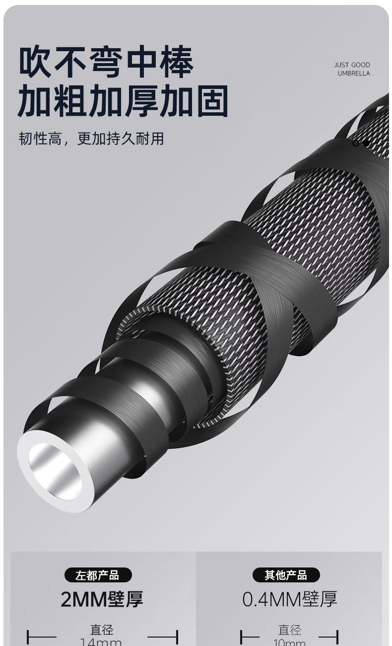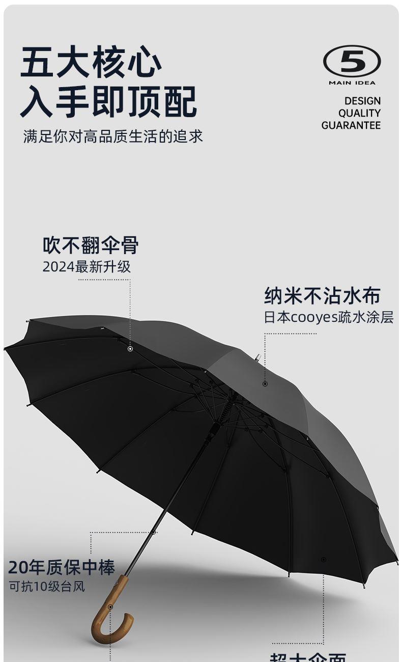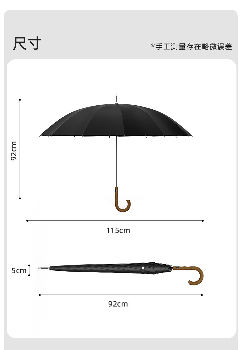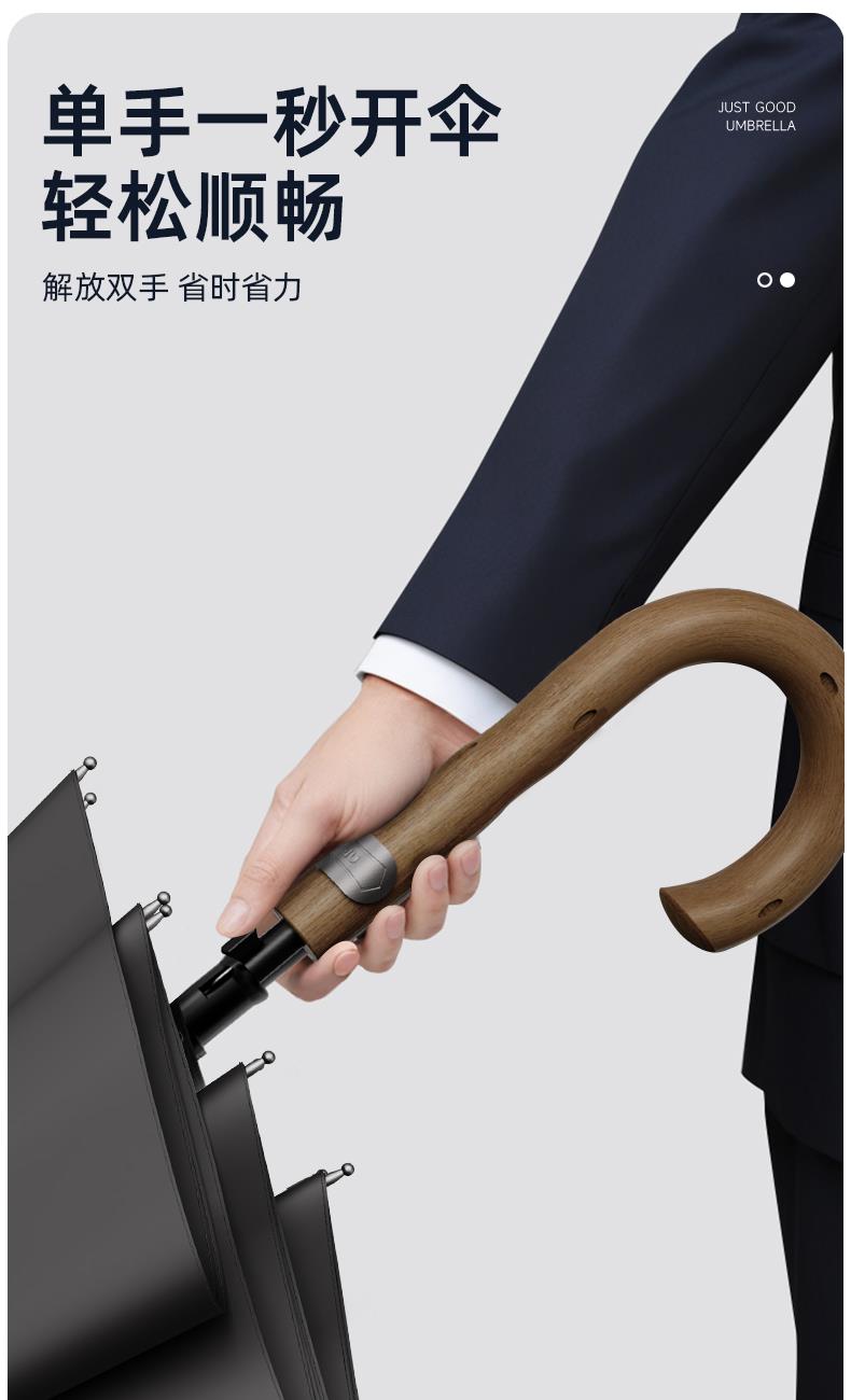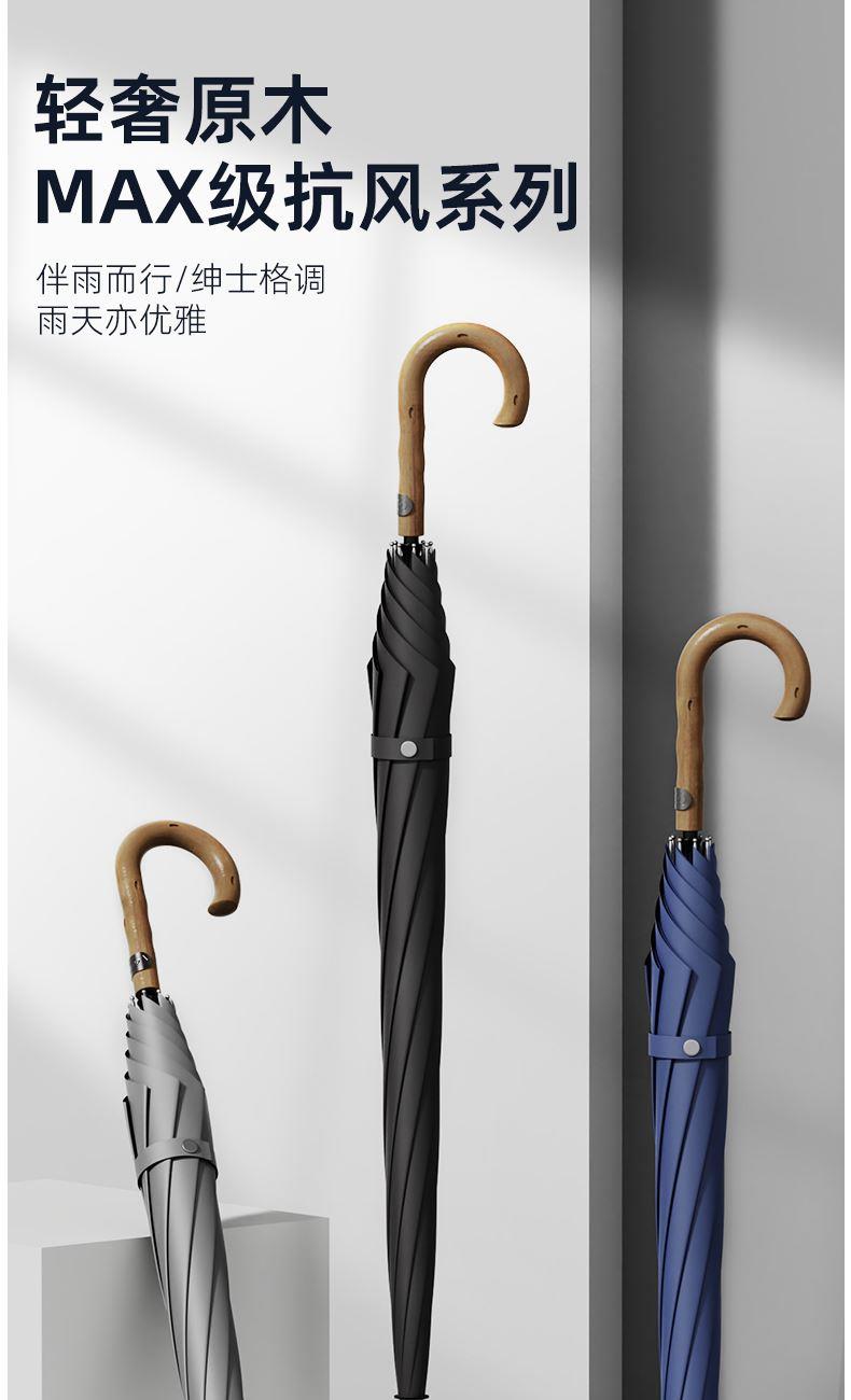商品货号:ZD2560() 伞架材质:合金钢中棒 玻纤伞架 藤木手柄 伞面材质:280T抨击布 款式:12K半自动长柄伞 商品参数:直径:115cm 高度:92cm 收拢直径:6cm 收拢高度:92cm 商品毛重:560克 商品颜色:黑色 灰色 蓝色 配置及定制:支持伞面logo定制(具体定制费用高另外核算)
