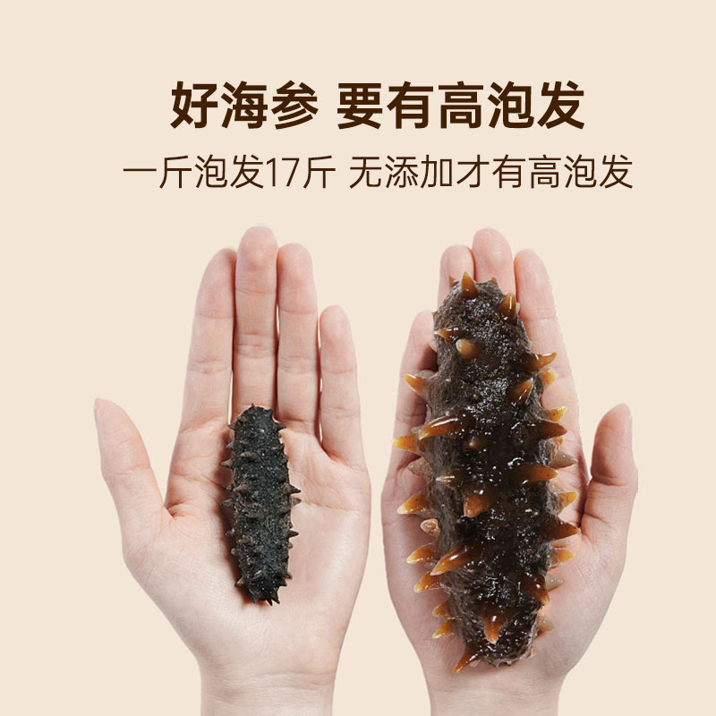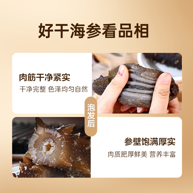 源自大连北纬39°黄金海域,冷水慢养,造就出众品质。 采用传统淡干工艺,营养保留更完整,更便于储存与运输。 富含优质蛋白与多种微量元素,特有的海参多糖与皂苷。 泡发后肉质肥厚,口感Q弹劲道,鲜美醇正。