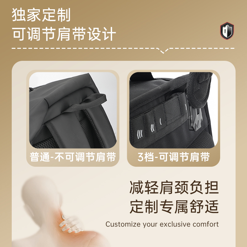 9.肩带上部三档位置调节,下部织带随意调节,带肩带固定扣.