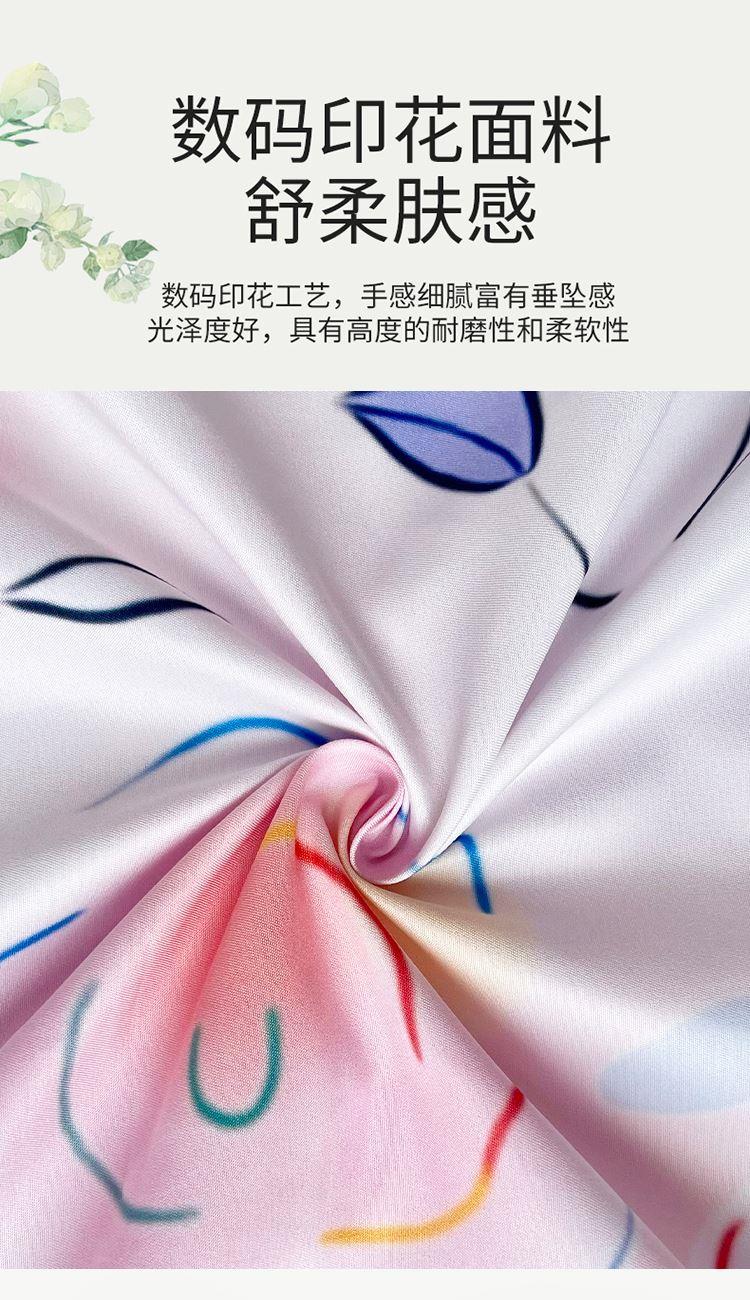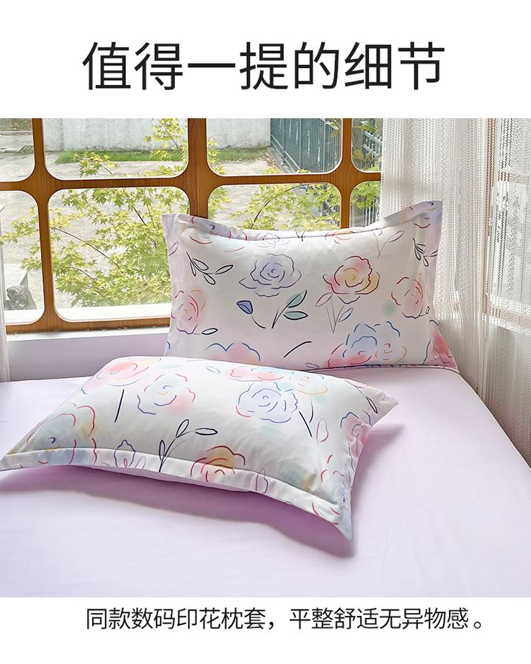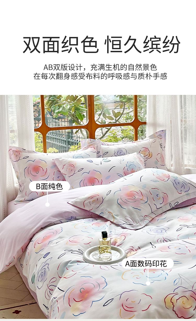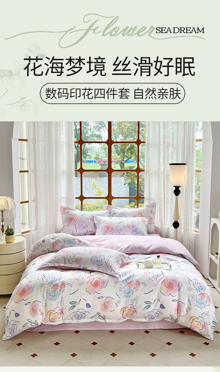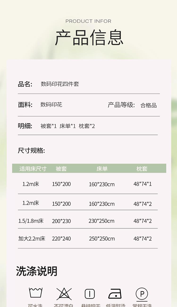 1:花海梦境 丝滑好眠 数码印花四件套 自然亲肤 2:馥郁花镜蔓延蕴藏温柔本真 以田园花卉为设计灵感当冰雪融化,万物生长花草竞相开放,生机盎然 3:双面织色 恒久缤纷 AB双版设计,充满生机的自然景色在每次翻身感受布料的呼吸感与质朴手感 尺寸:被套200*230cm*1 床单:230*250cm*1 枕套:48**74cm*2 包装:天地盖彩盒