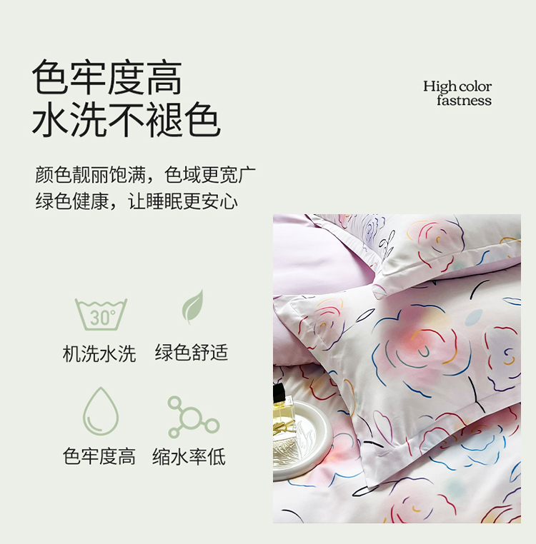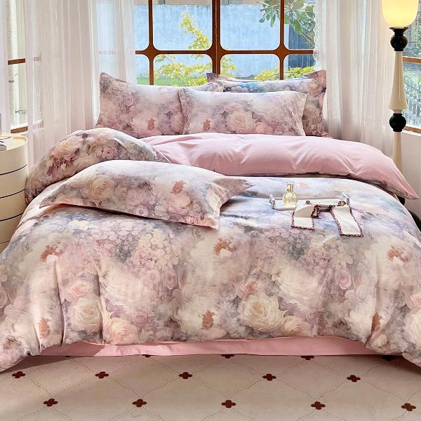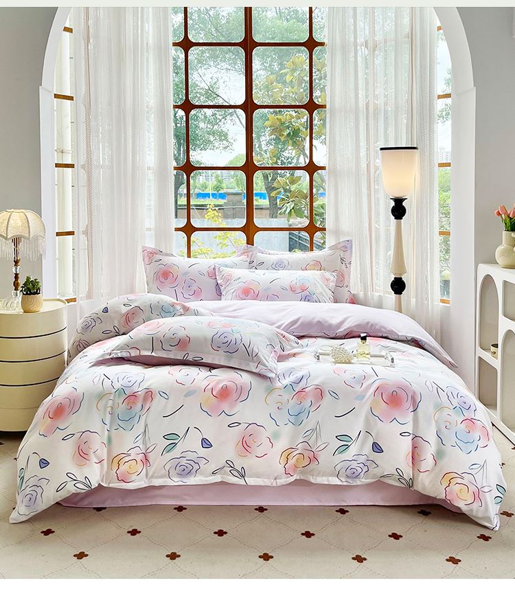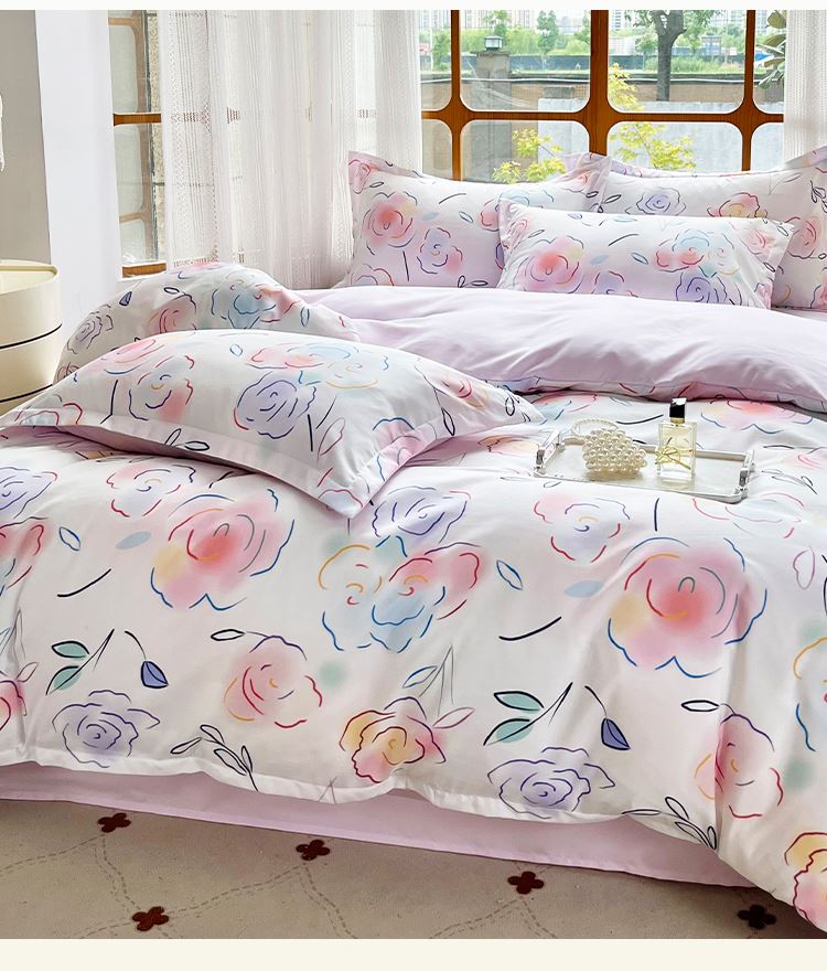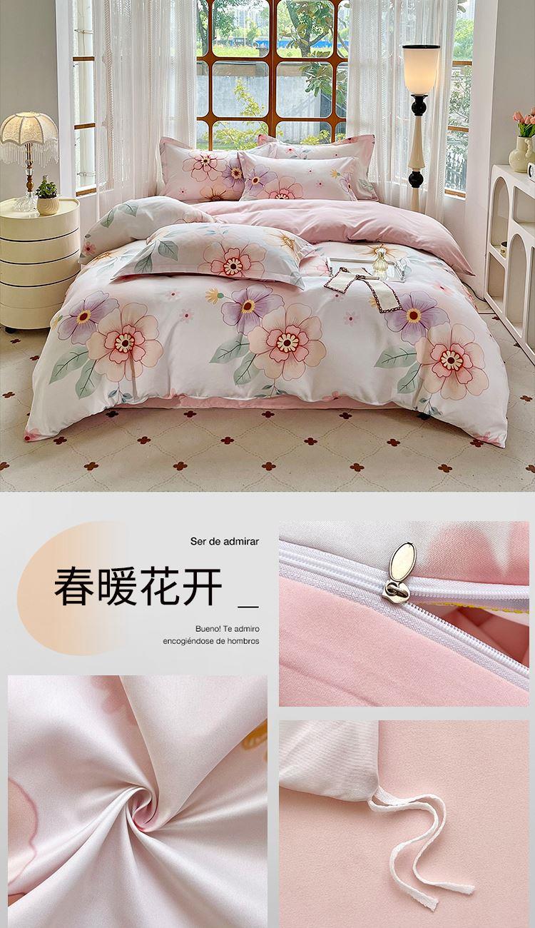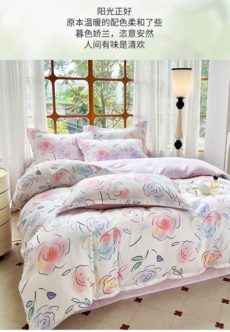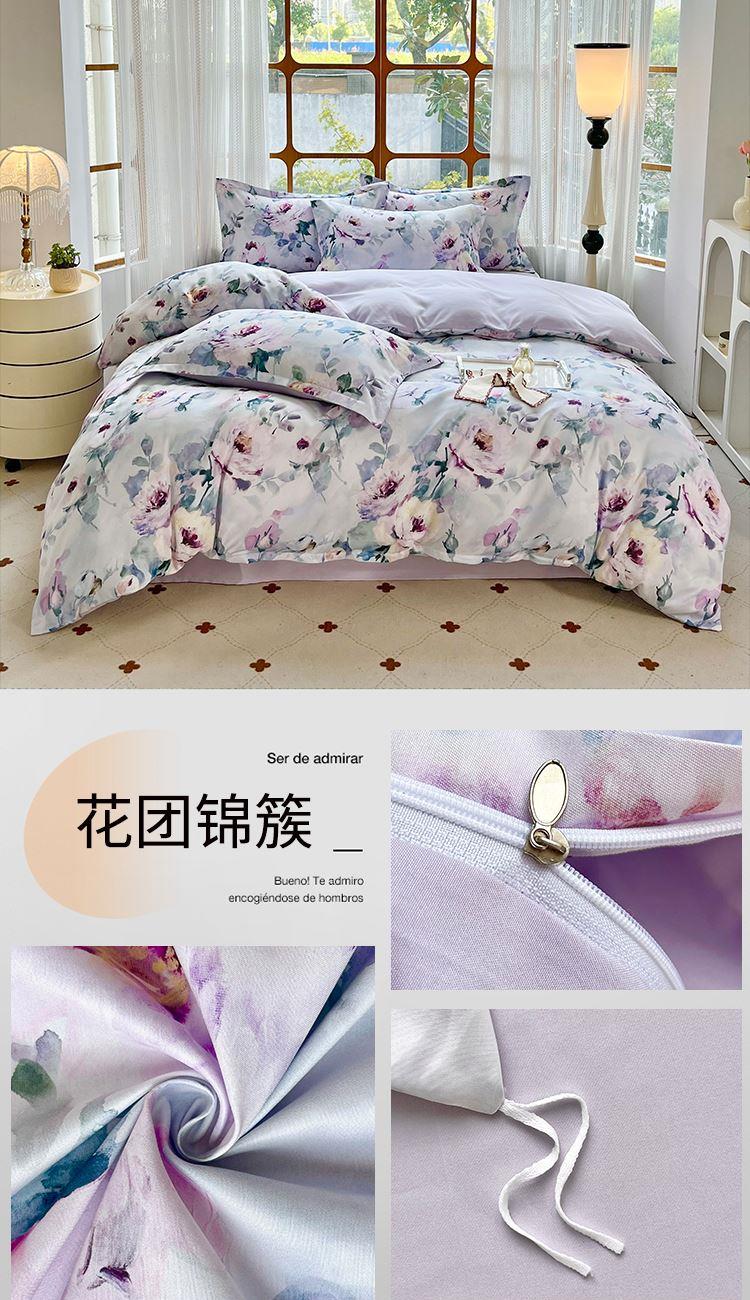 1:花海梦境 丝滑好眠 数码印花四件套 自然亲肤 2:馥郁花镜蔓延蕴藏温柔本真 以田园花卉为设计灵感当冰雪融化,万物生长花草竞相开放,生机盎然 3:双面织色 恒久缤纷 AB双版设计,充满生机的自然景色在每次翻身感受布料的呼吸感与质朴手感 尺寸:被套200*230cm*1 床单:230*250cm*1 枕套:48**74cm*2 包装:天地盖彩盒