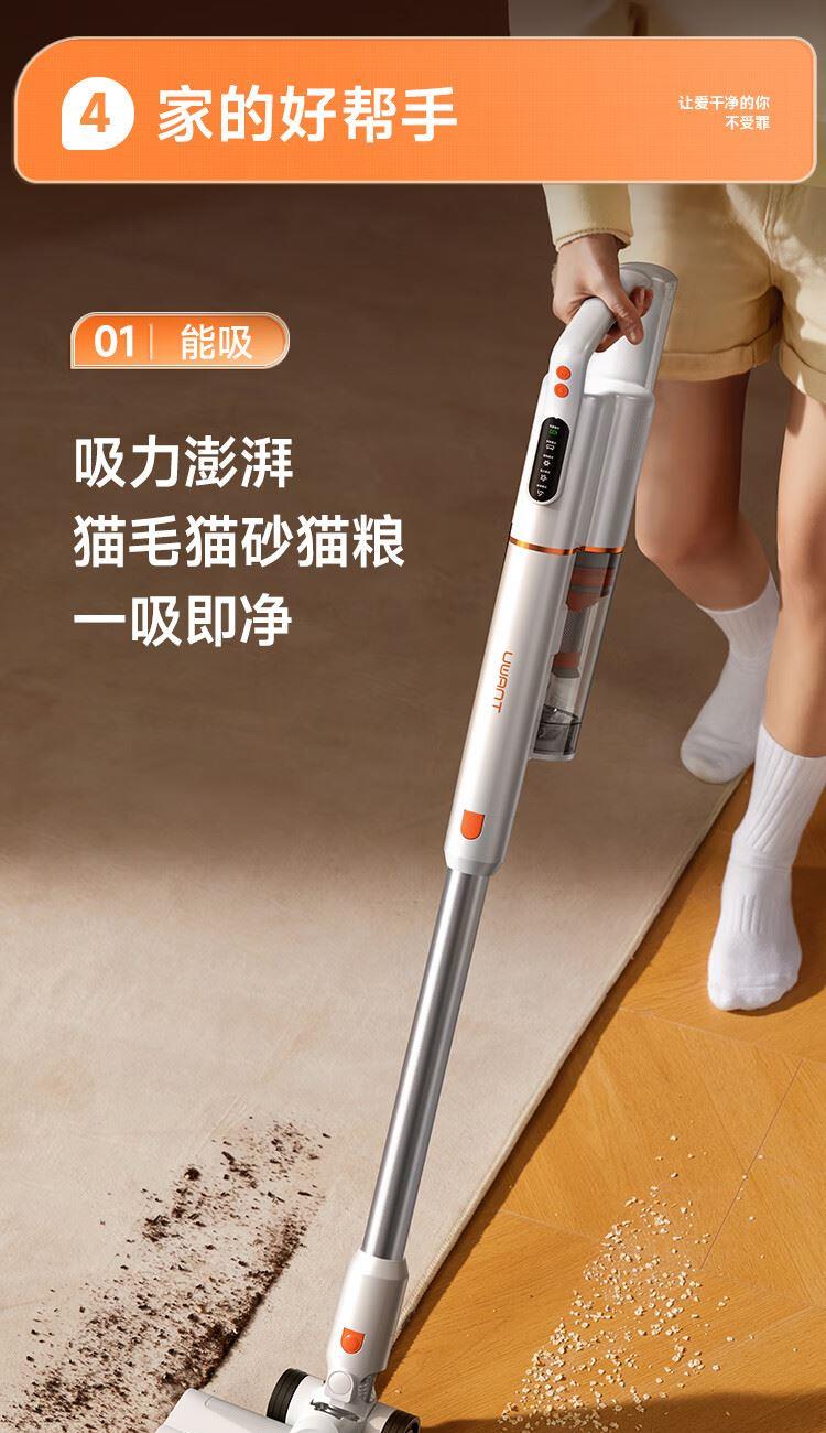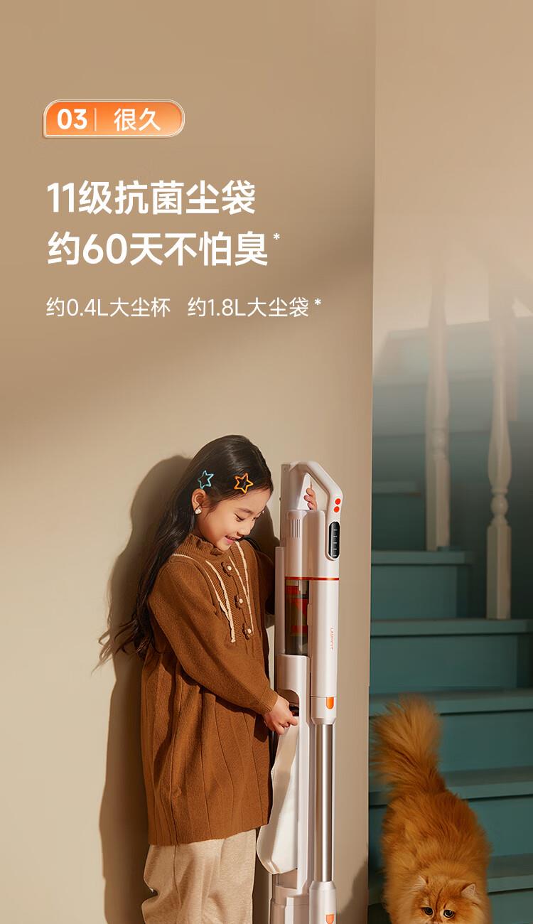 主电机吸入功率:~170AW 主机吸力:~23kPa* 电池容量:7节共2000mAh(串联) 档位调节:3档(标准/强力/超强) 尘杯类型:单杯 屏幕显示:LED 尘杯尘袋容量:≈0.4L ~1.8L 每个刀齿轨迹都经过约1400次*机械臂模拟验证 约0.4L大尘杯 ,约1.8L大尘袋 PM2.5轻松拿捏,更能过滤掉约99%1微米以下的细菌,尘螨、真菌孢子等过敏原,呼吸更健康,鼻炎也不怕。