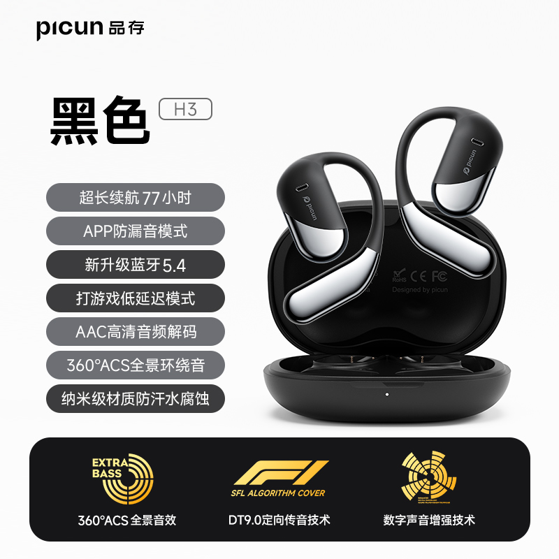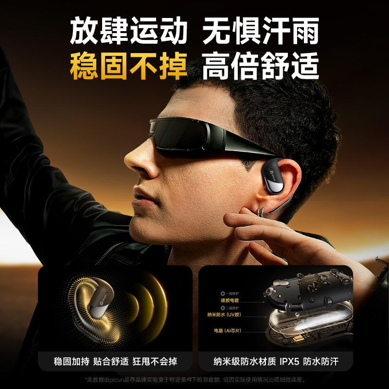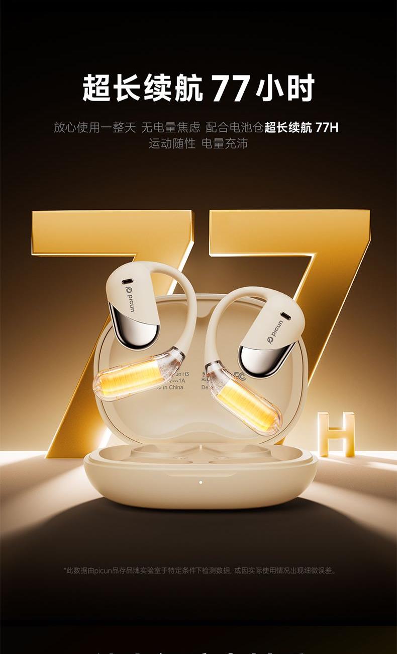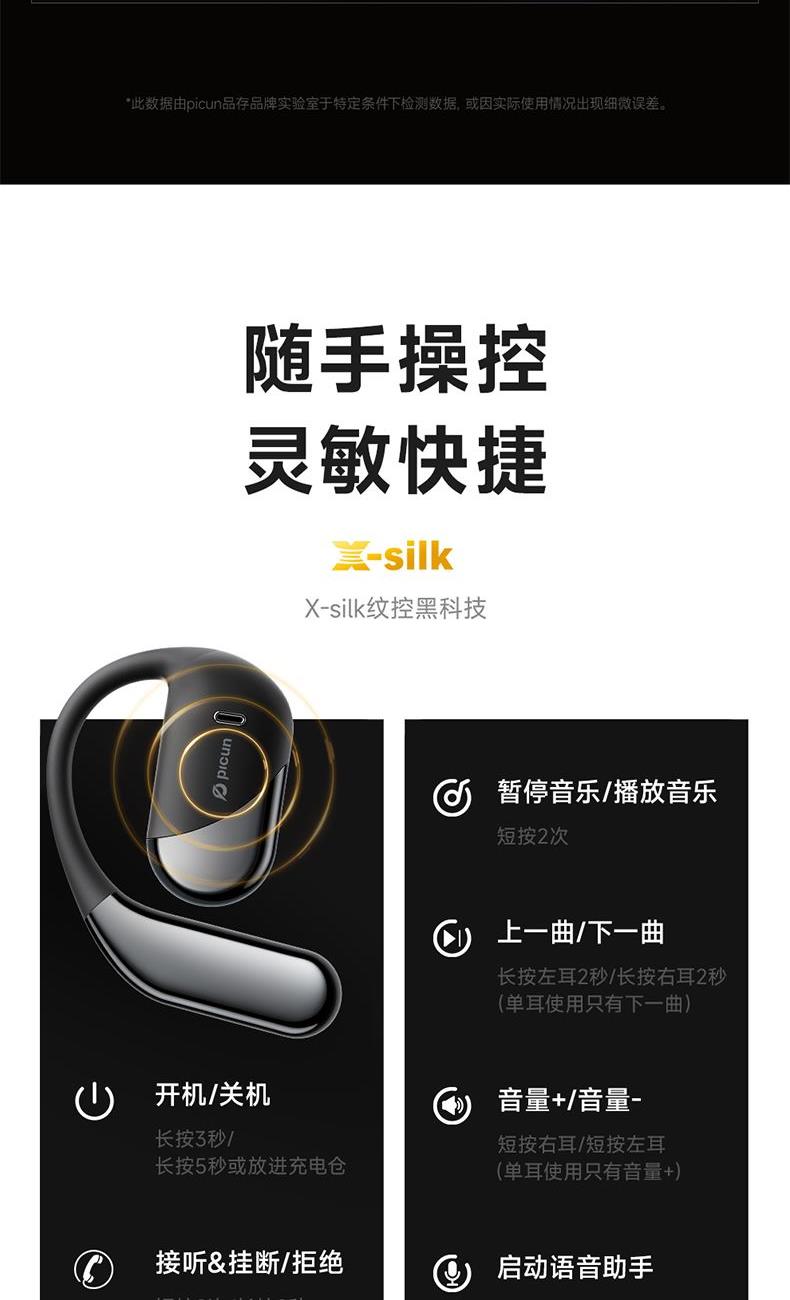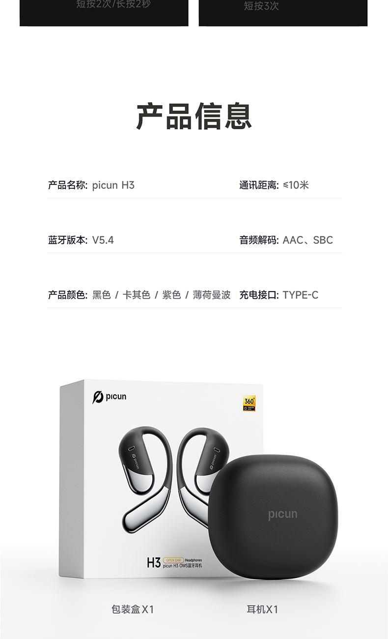 颜色:黑色、卡其白 蓝牙方案:AD6973D8 蓝牙版本:V5.4 电池容量:400mA 使用时间(70%音量):≈8h 蓝牙协议:A2DP、AVRCP、HSP、HFP 接收距离:10m 喇叭尺寸:14.2mm 有效频率响应:50Hz-3000Hz 麦克风灵敏度:-42±1dB 充电接口:TYPE-C 1、支持【picun品存】APP智能互联控制 2、自带算法降噪技术 3、8级防水,防潮防汗