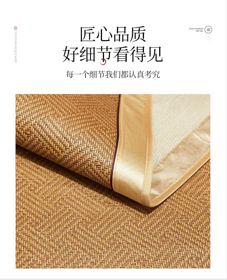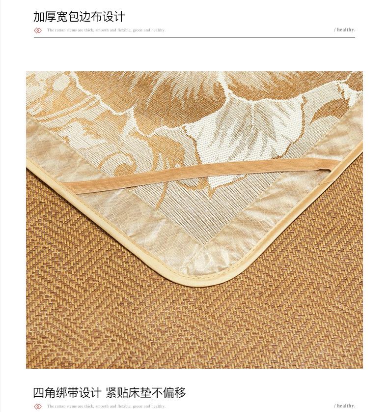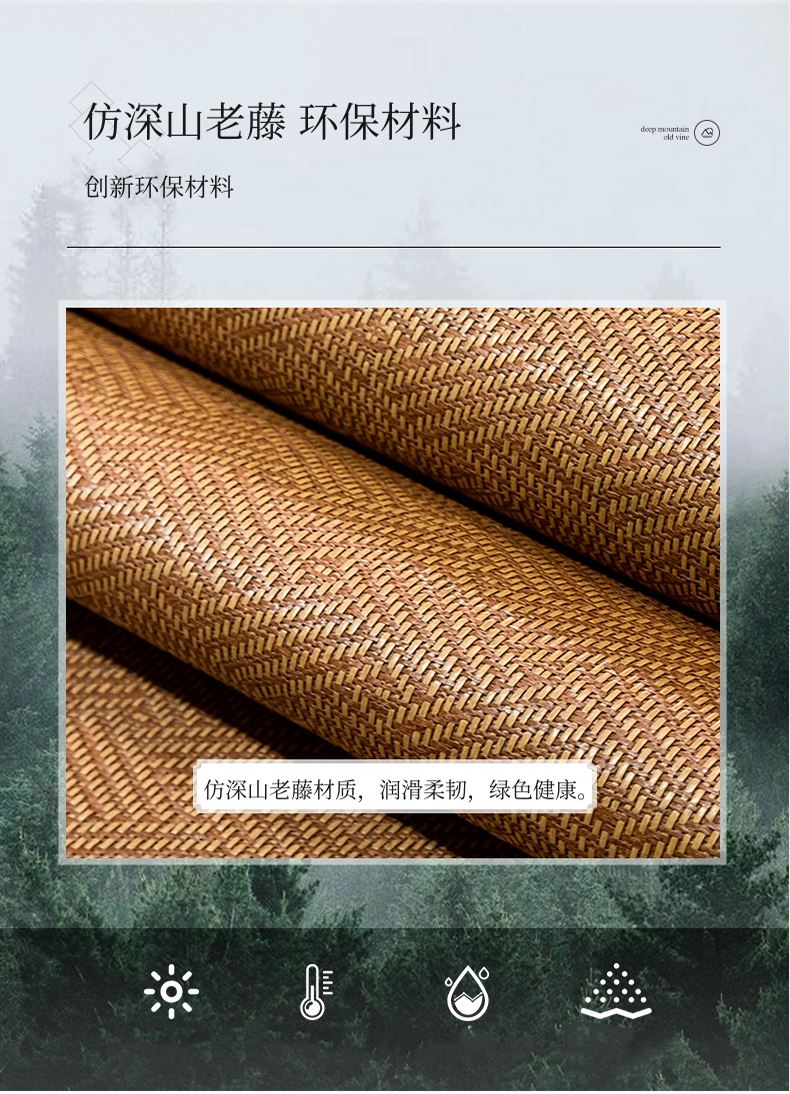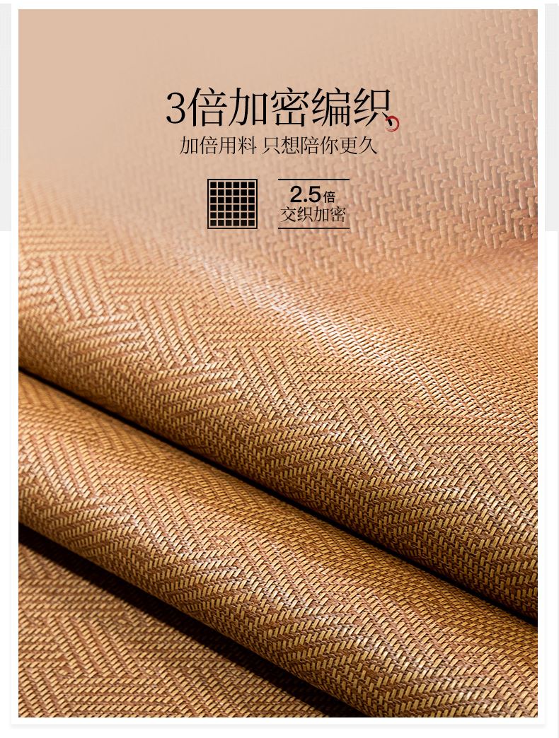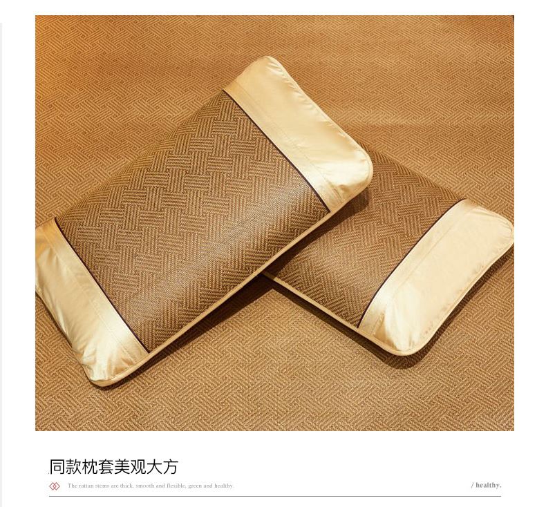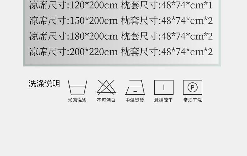 规 格:凉席 150*200cm*1 枕套 48*74cm*2 花 型:饼干花 材 质:横向:纤维素材料 直向:纤维素材料 包边:聚酯纤维 升级款 正反皆可用,正面仿藤面料,席面光滑无刺,编织紧密,祼睡不伤发肤,凉而不冰,老少皆宜;背面冰丝面料透气无纺布,拒绝异味;细节更是加厚宽包边布设计,四角绑带 紧贴床垫不偏移,搭配同款枕套 美观大方。