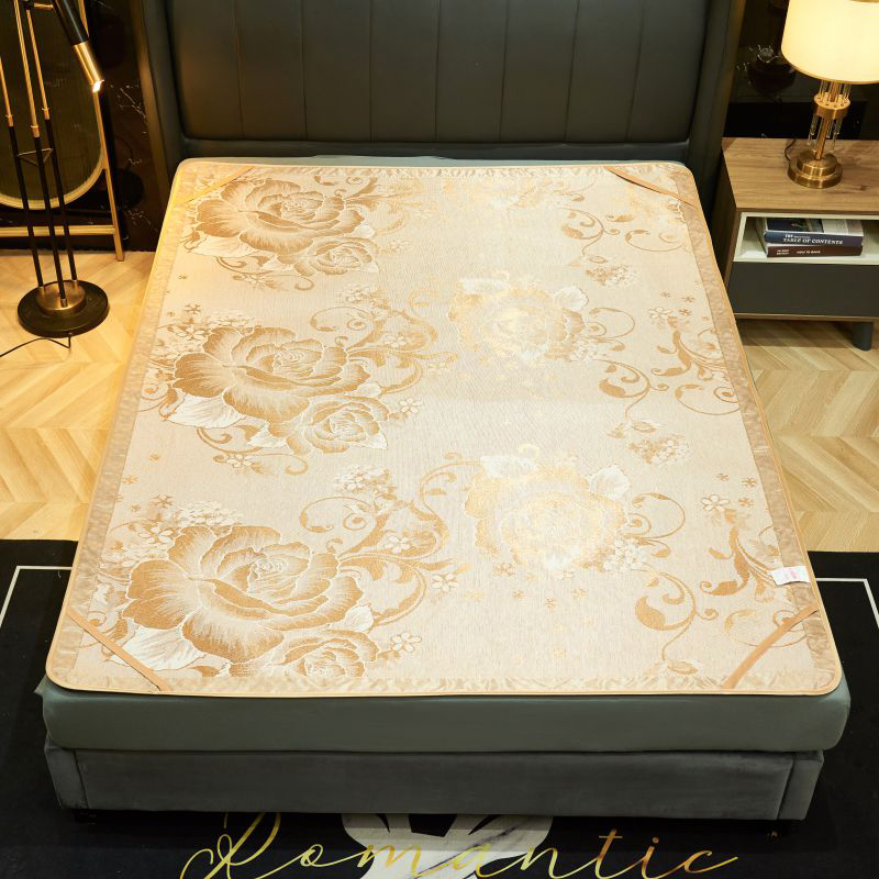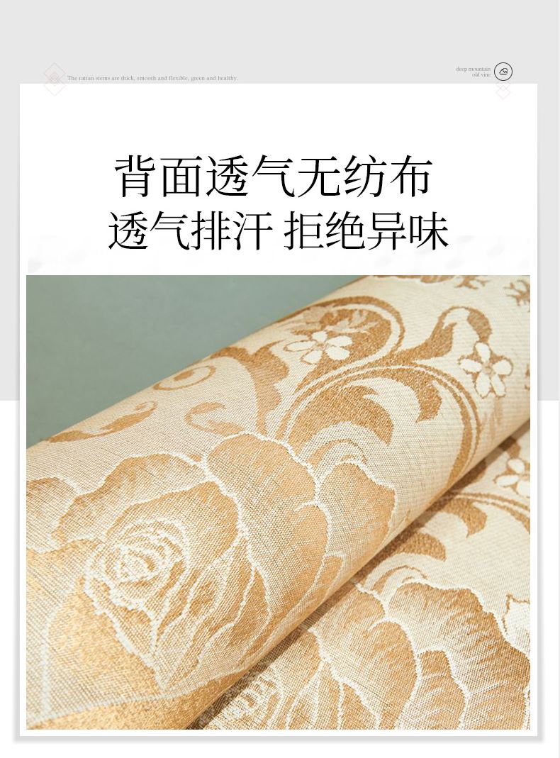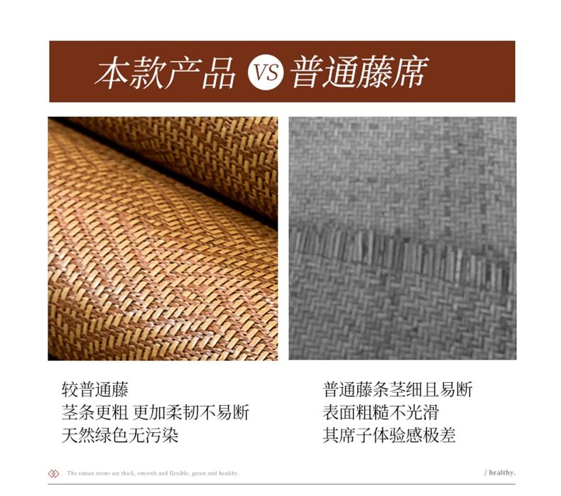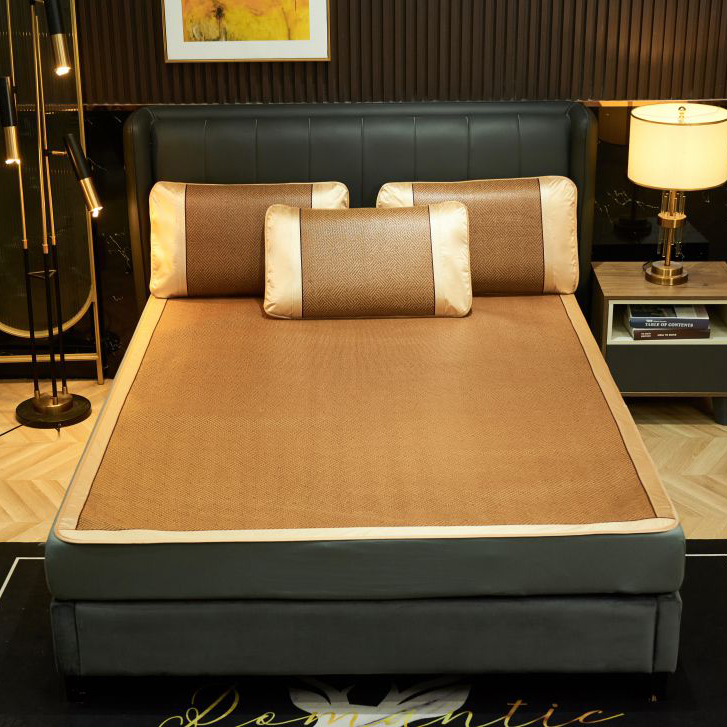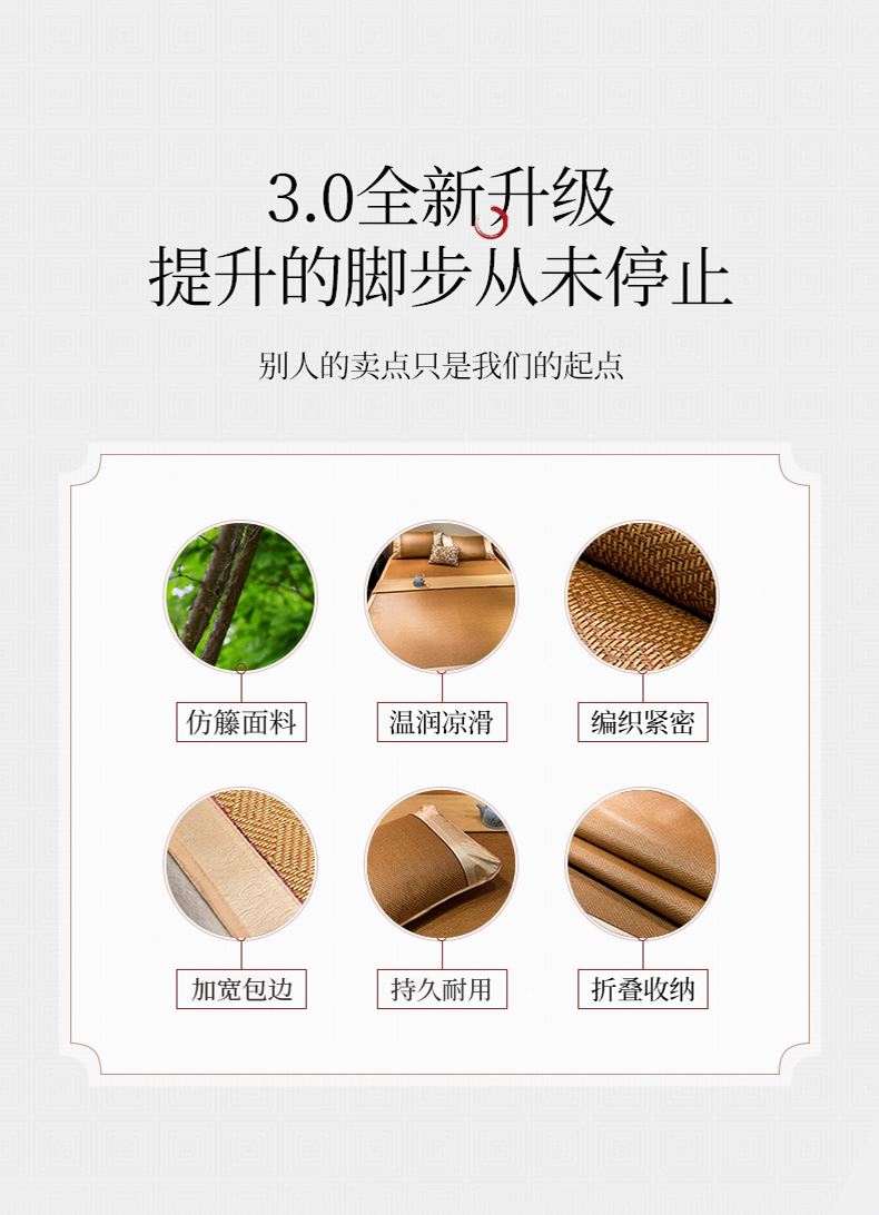 规 格:凉席 150*200cm*1 枕套 48*74cm*2 花 型:饼干花 材 质:横向:纤维素材料 直向:纤维素材料 包边:聚酯纤维 升级款 正反皆可用,正面仿藤面料,席面光滑无刺,编织紧密,祼睡不伤发肤,凉而不冰,老少皆宜;背面冰丝面料透气无纺布,拒绝异味;细节更是加厚宽包边布设计,四角绑带 紧贴床垫不偏移,搭配同款枕套 美观大方。