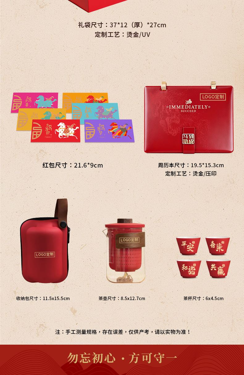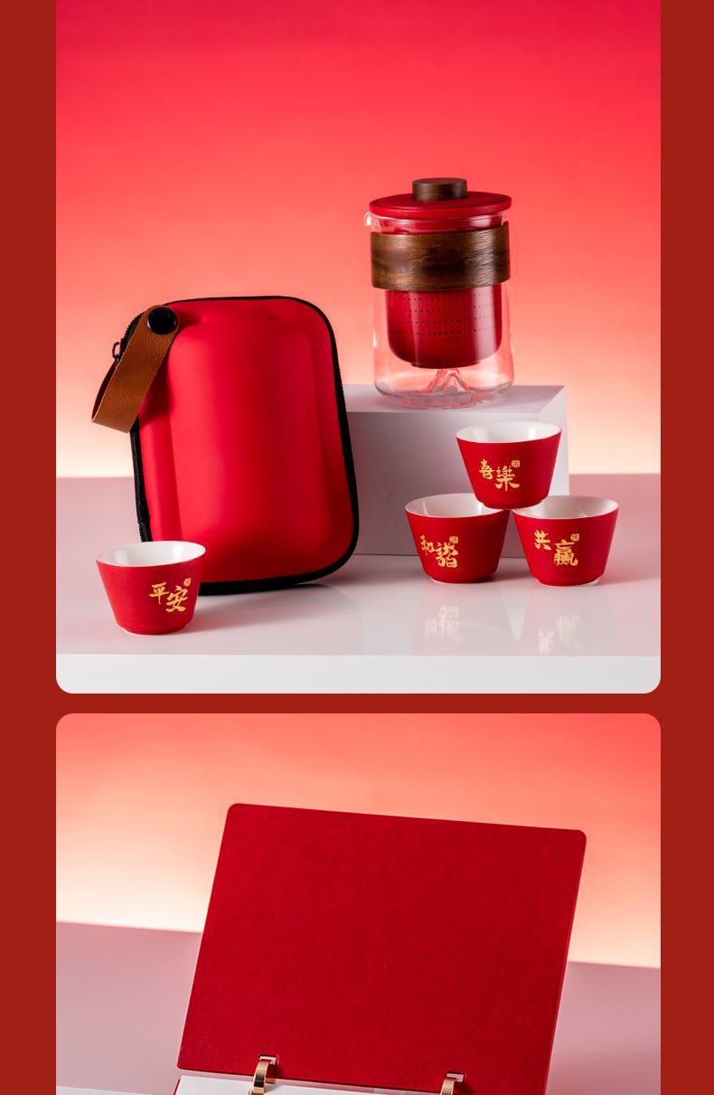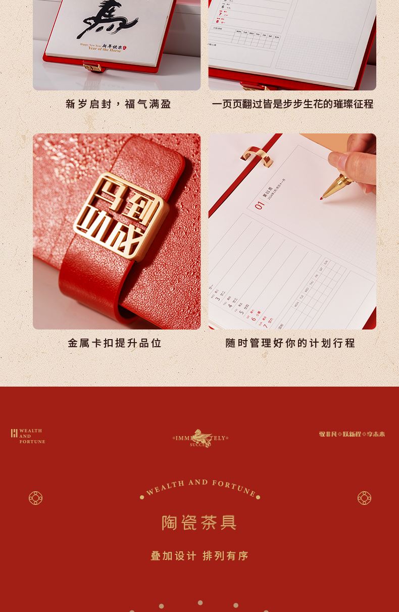 1、周历本:台历功能、目标管理功能、摆件功能 2、快客旅行茶具:一壶四杯配茶巾。 便携式茶具套装,收纳自如,一壶四杯的特殊设计,能与三五好友共享茶香。 3、新年红包*6:开启新年好运程
