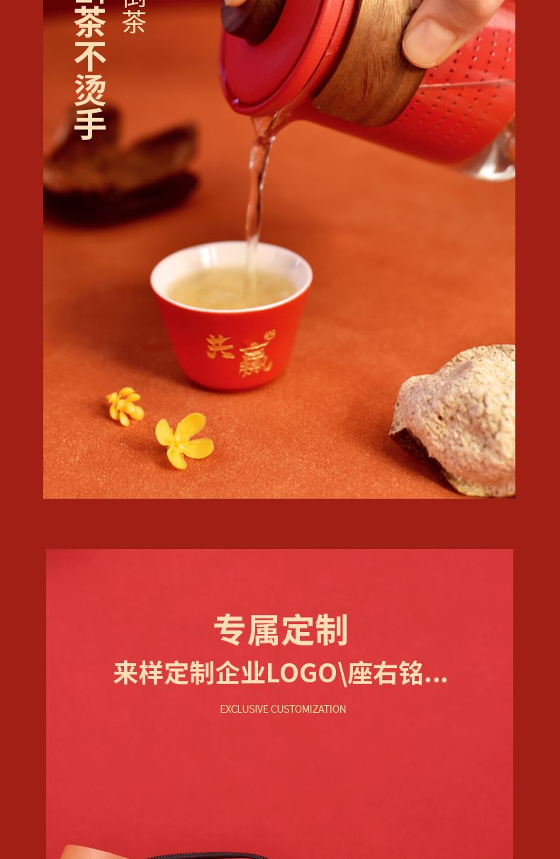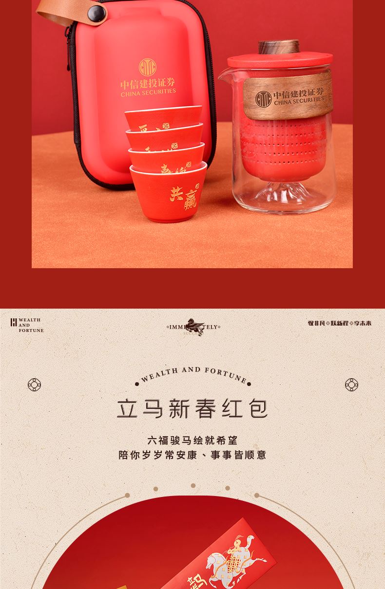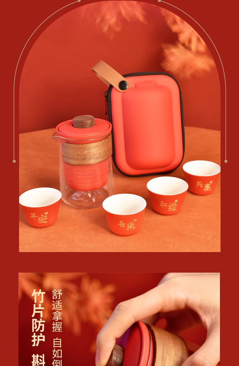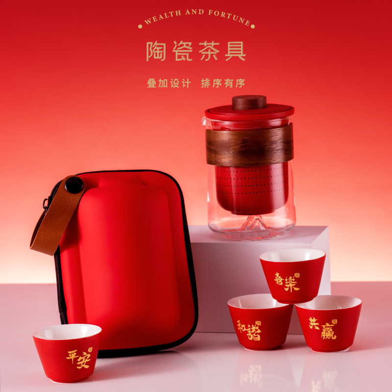 1、周历本:台历功能、目标管理功能、摆件功能 2、快客旅行茶具:一壶四杯配茶巾。 便携式茶具套装,收纳自如,一壶四杯的特殊设计,能与三五好友共享茶香。 3、新年红包*6:开启新年好运程