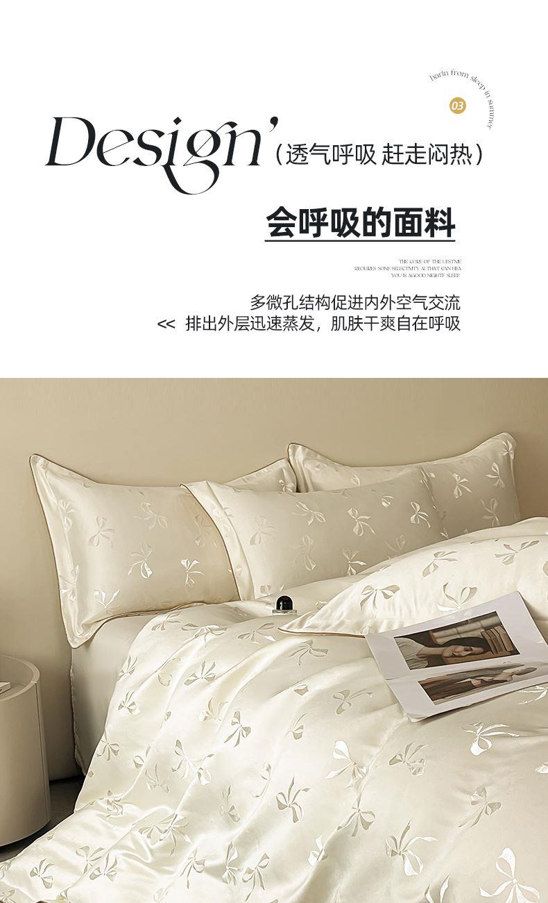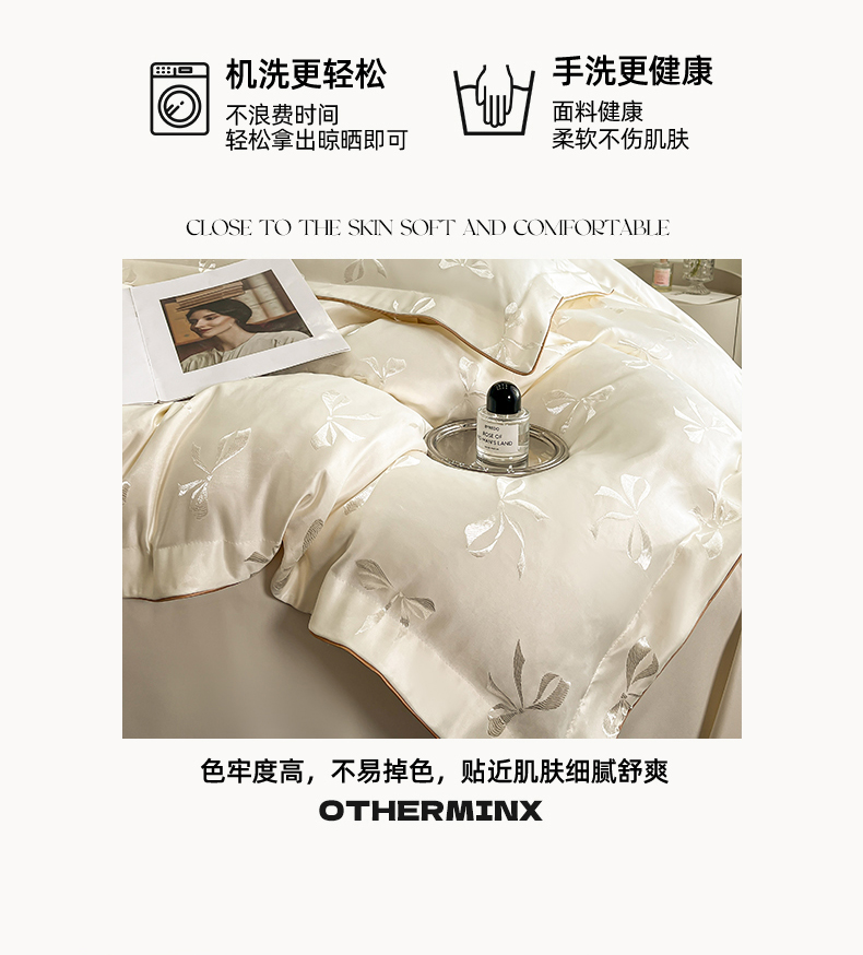 规格:被套200*230cm*1床单245*245cm*1枕套48x74cm*2 面料:聚酯纤维(水洗天丝) 花色:雅蝶-白、雅蝶-薄荷绿、雅蝶-粉、雅蝶-灰、雅蝶-蓝 闭眼感受 丝滑触感 细腻如丝 柔软若云的触感 仿佛能穿越时空 耐洗耐用 贴身丝滑 水洗天丝面料 AB版设计 活性印染 可机洗水洗 不易起球 水洗天丝快速吸收汗液和水分 导湿快 性能好 触感清爽不粘腻 贴肤沁凉不冰 空调房也能使用