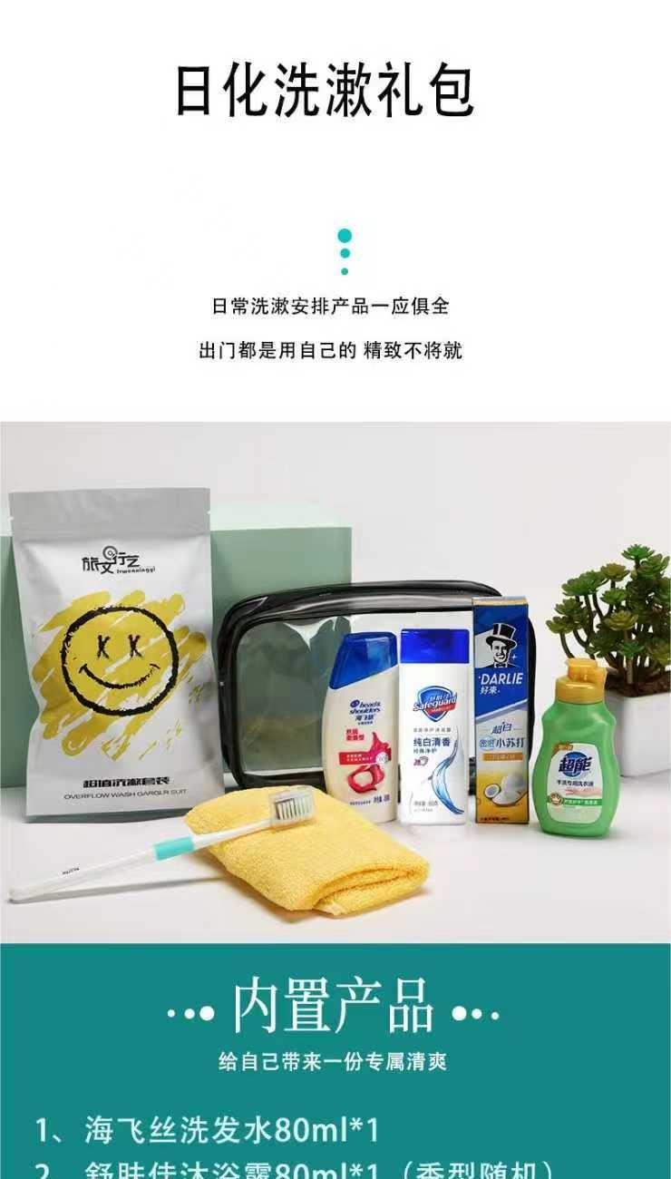 1、海飞丝洗发水80ml*1 2、舒肤佳沐浴露80ml*1(香型随机) 3、好来(黑人)牙膏40g*1 (香型随机) 4、旅文行艺牙刷*1 5、超能洗衣液80g*1 6、旅途宝竹纤维毛巾*1(50*25cm) 7、防水毛巾收纳袋 8、PVC磨砂防水收纳袋*1 这款产品套装涵盖了清洁护理用品和个人旅行配件,为您提供全面的日常护理和旅行保障。其中包括海飞丝洗发水、舒肤佳沐浴露、好来(黑人)牙膏等高品质的个人洗护产品,以及旅文行艺牙刷、超能洗衣液、旅途宝竹纤维毛巾等实用工具。同时,我们还提供了防水毛巾收纳袋和PVC磨砂防水收纳袋等物品整理解决方案。这些产品既实用又美观,让您的生活更便捷、舒适和安全。