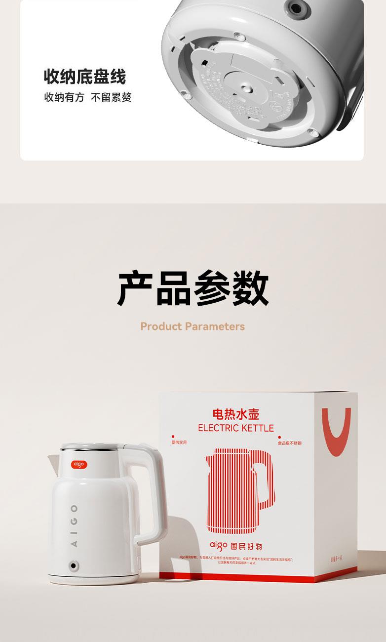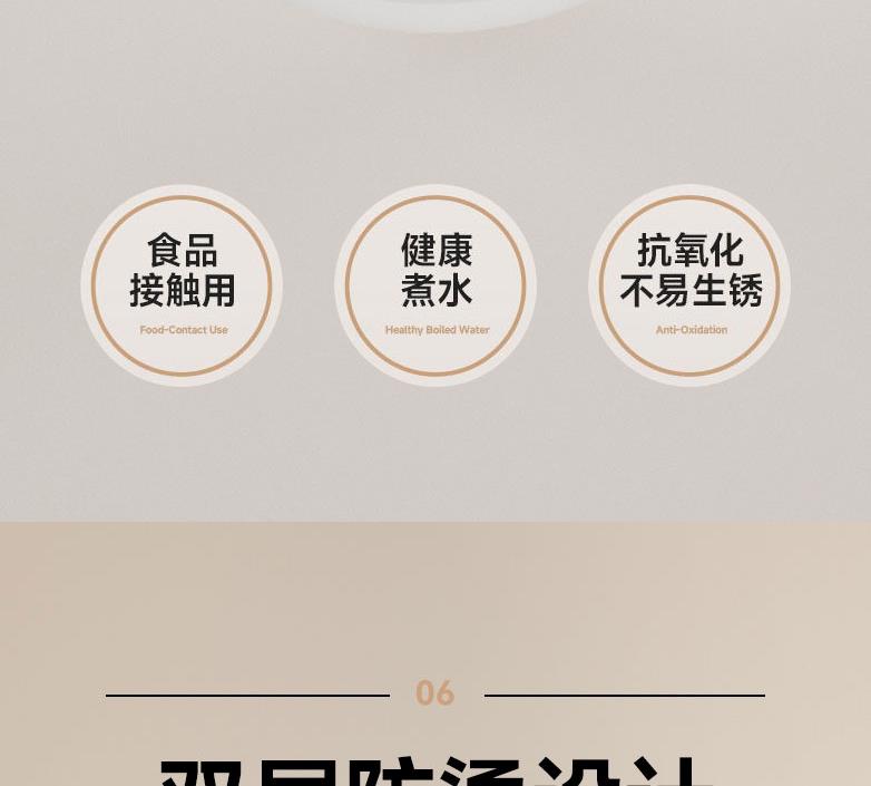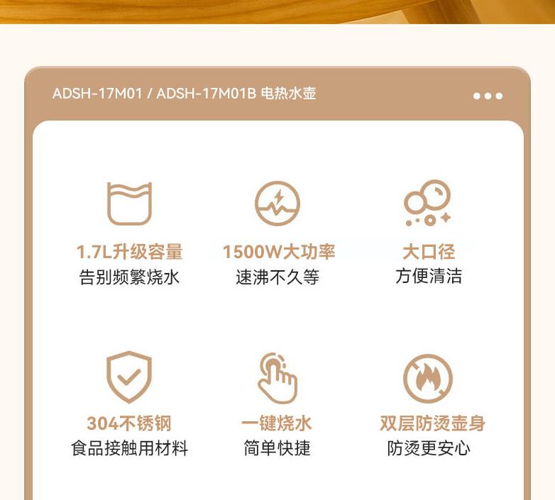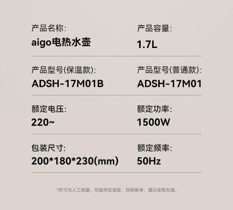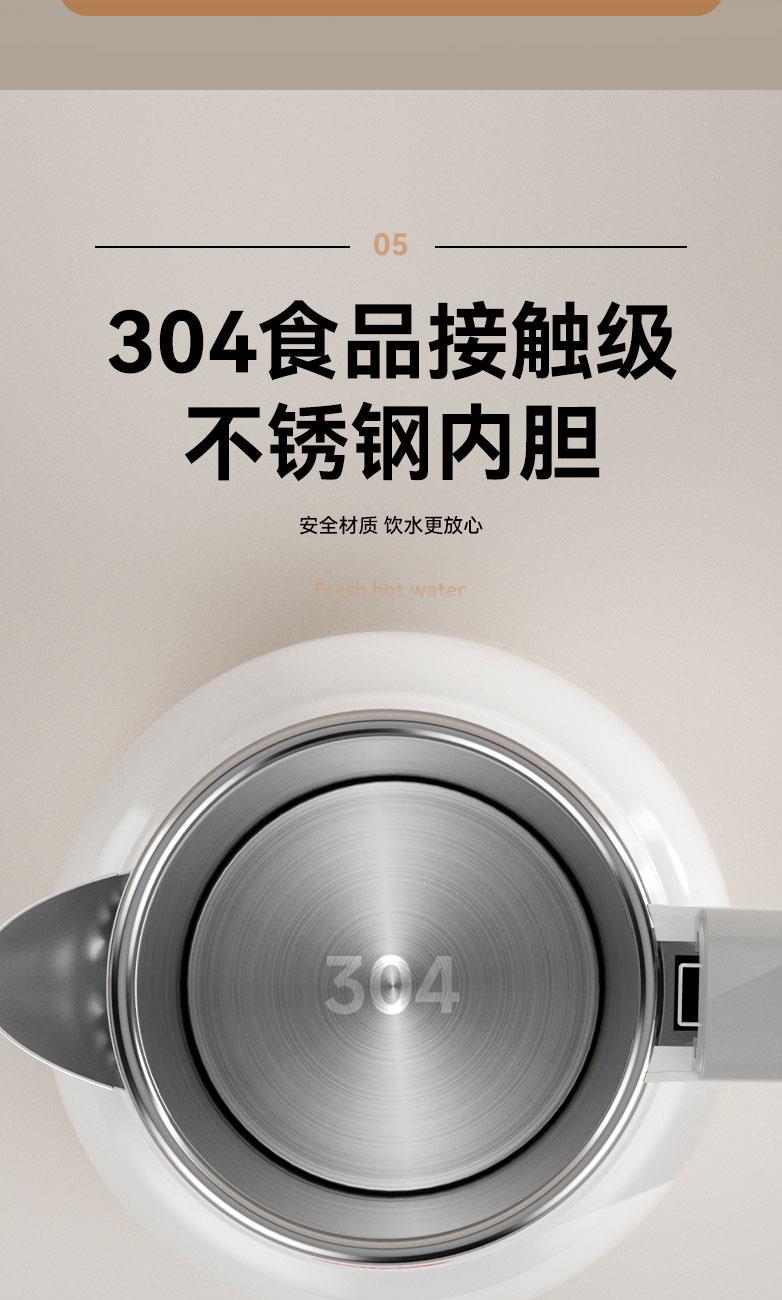 轻奢裸色,暖系百搭 三层防烫壶身,使用更安全 食品级不锈钢,安全更环保 1.7L大容量,更符合现代人饮水需求 加热速度快,更加高效 防干烧设计,保障用户安全 功率:1500W 容量:1.7L 包装尺寸:200*180*230mm 包装方式:彩邮外 毛重:1.09kg