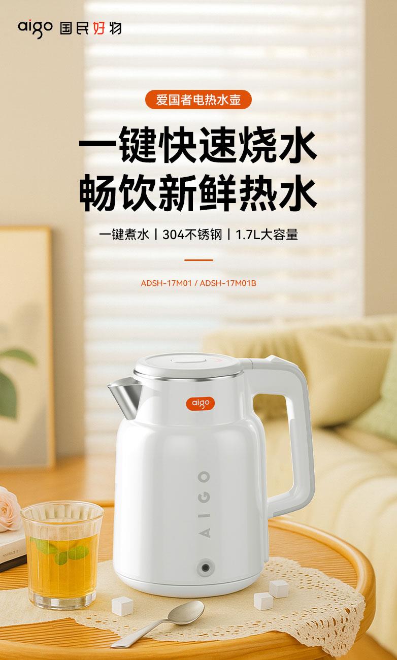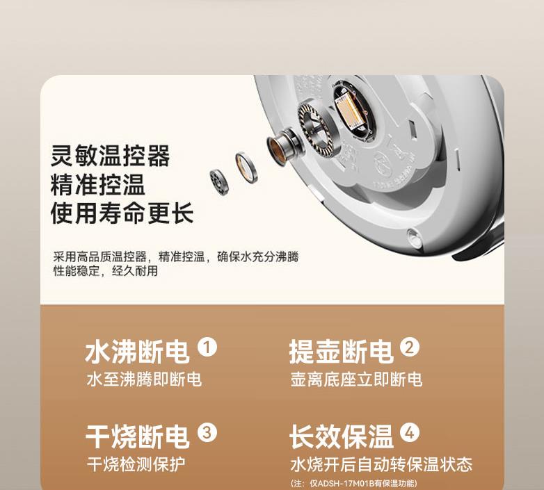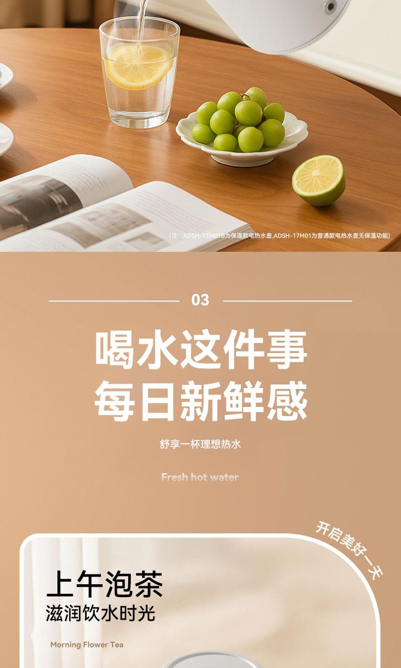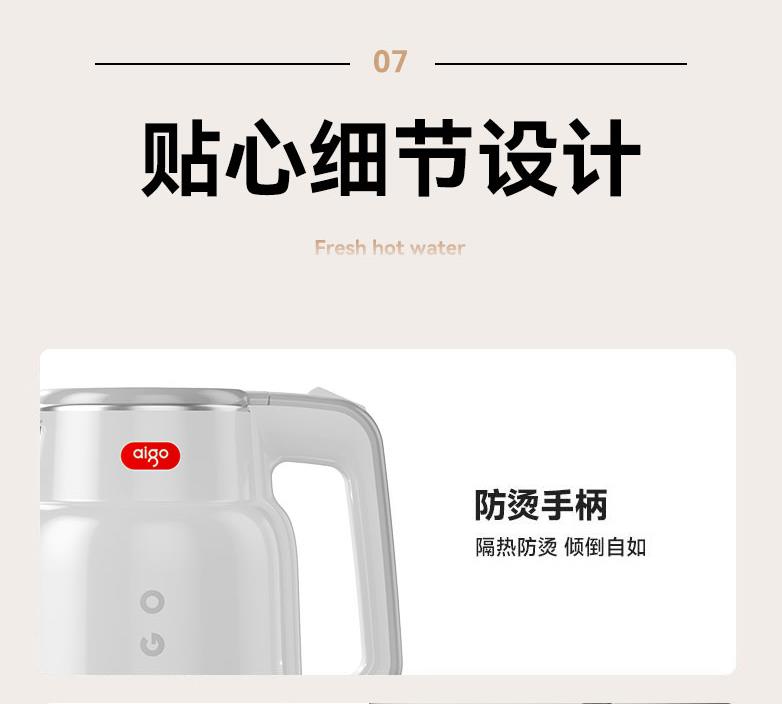轻奢裸色,暖系百搭 三层防烫壶身,使用更安全 食品级不锈钢,安全更环保 1.7L大容量,更符合现代人饮水需求 加热速度快,更加高效 防干烧设计,保障用户安全 功率:1500W 容量:1.7L 包装尺寸:200*180*230mm 包装方式:彩邮外 毛重:1.09kg