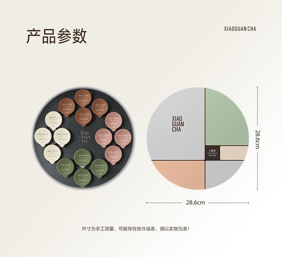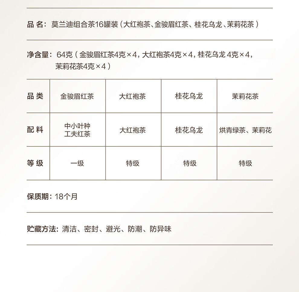 净含量:64克(金骏眉红茶4克x4,大红袍茶4克x4,桂花乌龙茶4克x4,茉莉花茶4克x4)