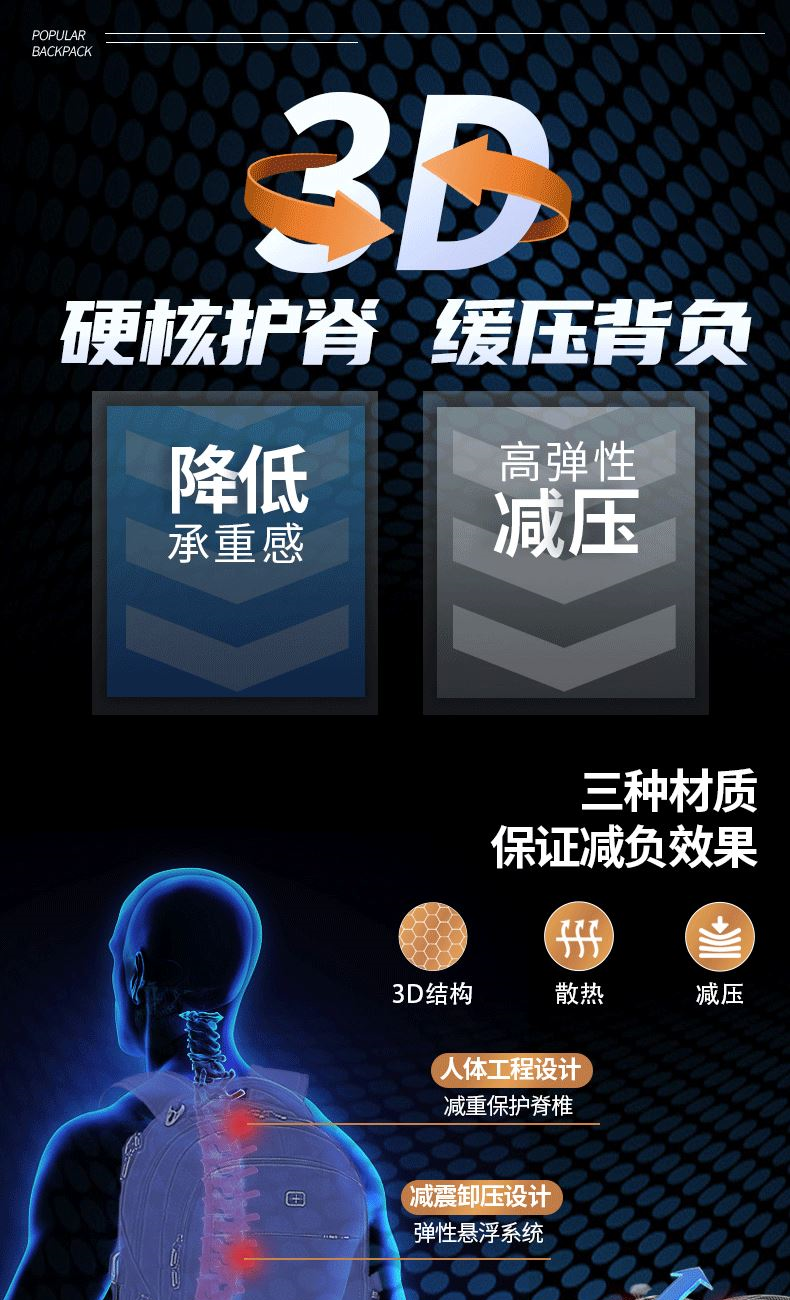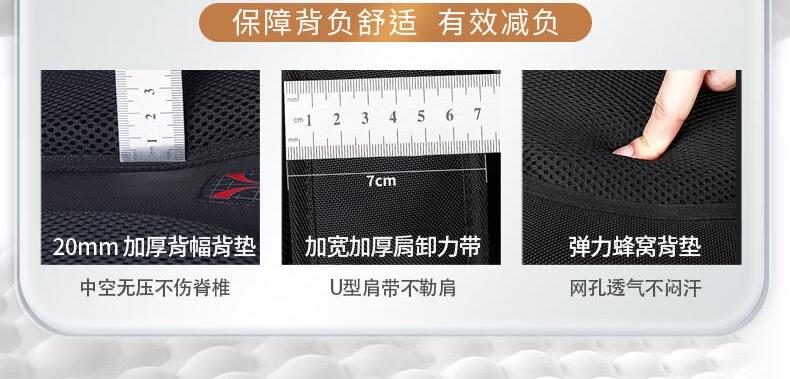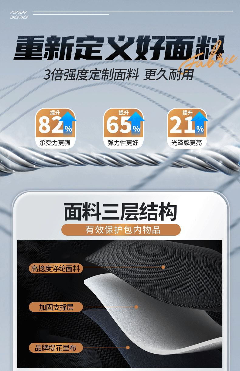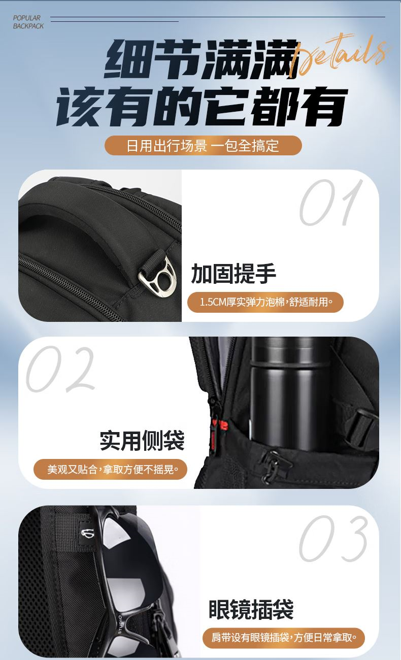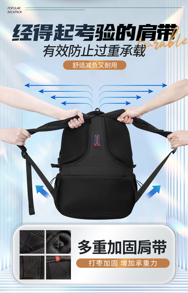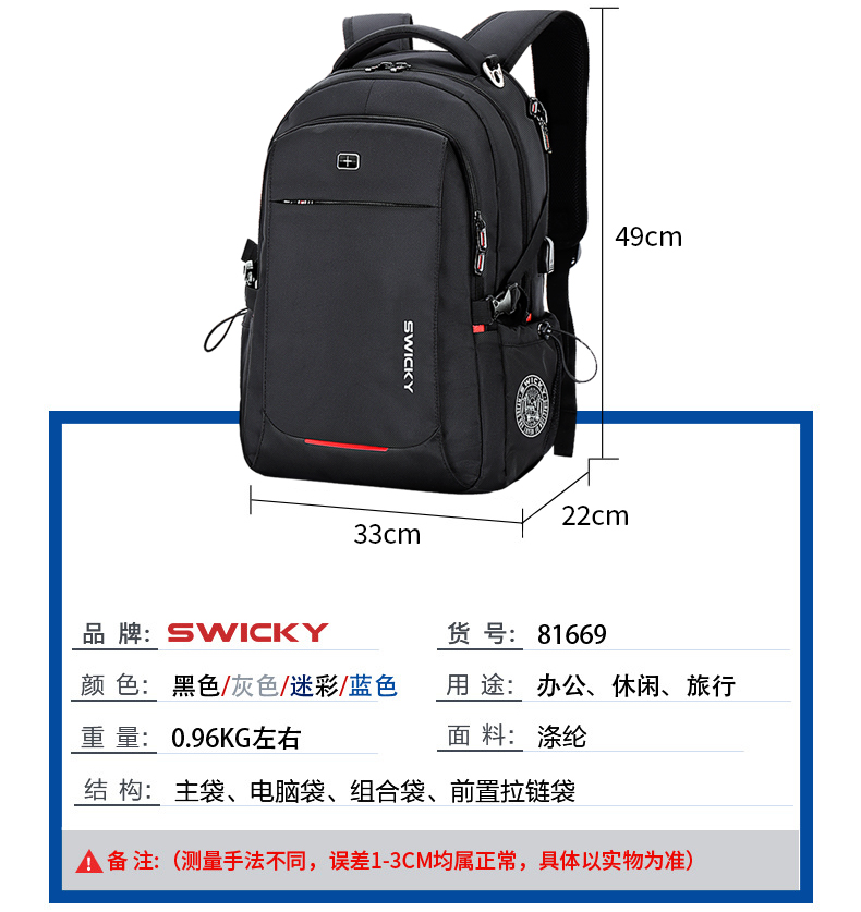 型 号:81669 黑色大号(鞋仓+防盗款) 尺 寸:220*330*490(MM)大号 材 质:聚酯纤维 颜 色:黑色 重 量:1.15KG 1.内置15.6寸电脑隔层,文具收纳组,大容量衣物主袋. 2.采用防波水面料,经久耐用。 3.采用物理机械防盗拉链,防暴力开启,让物品更安全。 4.加厚背板,加宽加厚肩带设计,增加受力面积,背负更舒适. 5.干湿分离鞋仓款 出行方便.;