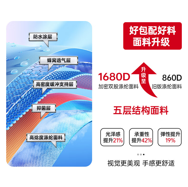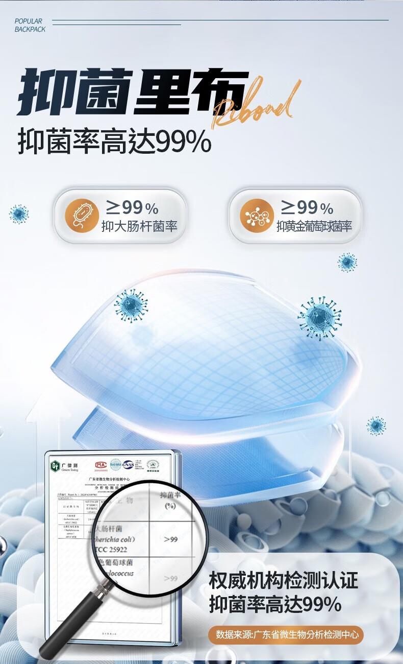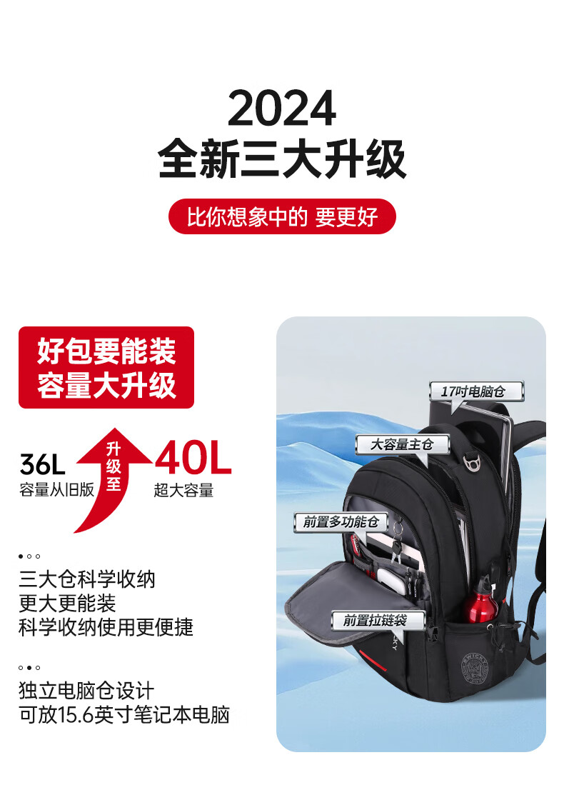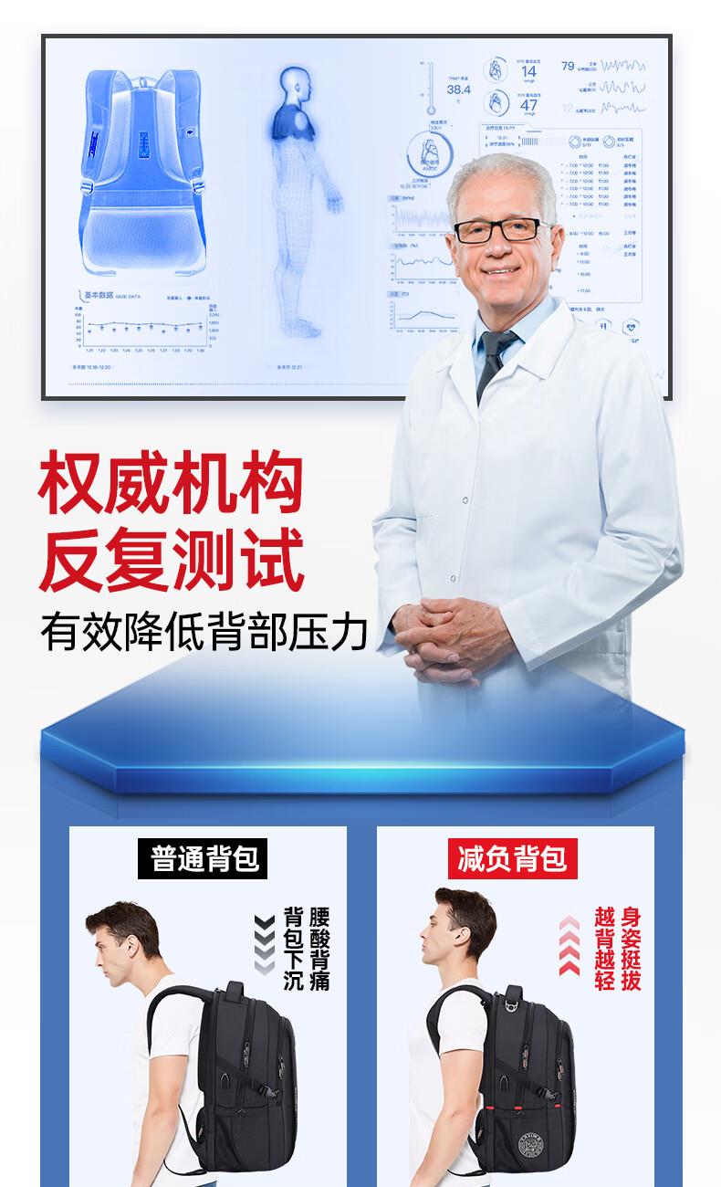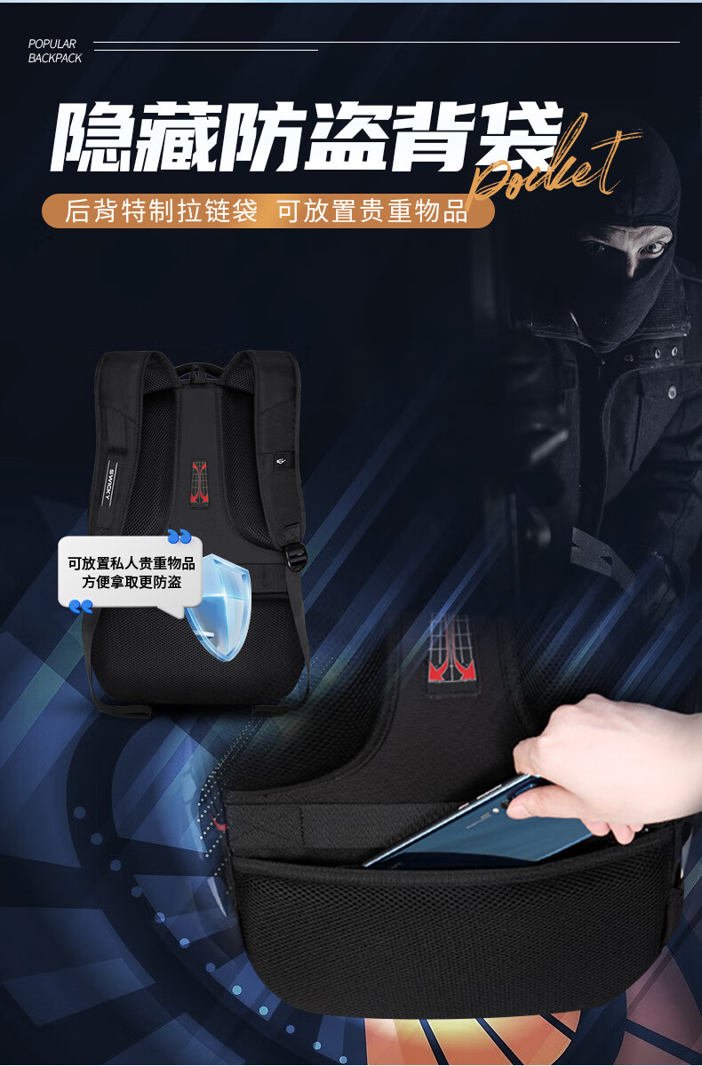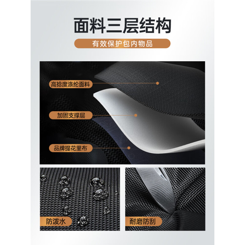 型 号:81669 黑色大号(鞋仓+防盗款) 尺 寸:220*330*490(MM)大号 材 质:聚酯纤维 颜 色:黑色 重 量:1.15KG 1.内置15.6寸电脑隔层,文具收纳组,大容量衣物主袋. 2.采用防波水面料,经久耐用。 3.采用物理机械防盗拉链,防暴力开启,让物品更安全。 4.加厚背板,加宽加厚肩带设计,增加受力面积,背负更舒适. 5.干湿分离鞋仓款 出行方便.;