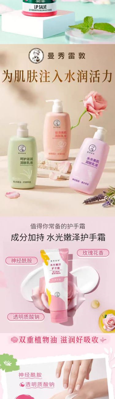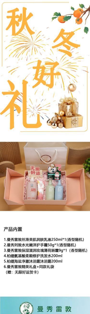 1.曼秀雷敦丝滑美肌润肤乳液250ml*1(香型随机) 2.曼秀列敦水光嫩泽护手霜50g*1(香型随机) 3.曼秀雷敦保湿滋润玫瑰薄荷唇霜9g*1(香型随机) 4.柏缇氨基酸柔顺修护洗发水200ml 5.柏缇海盐净澈沐浴露沐浴露200ml 6.曼秀雷敦精美礼盒+同款礼袋 (赠:无限好运贺卡) 【适用范围】 -教师节礼品、年会礼品、企业员工福利、银行保险、 积分兑换、随手礼、节日庆典