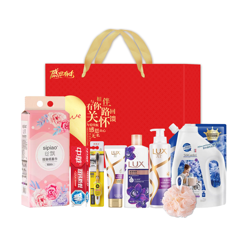 礼盒尺寸:32*8.5*24.5cm 包装尺寸:66*46.5*51CM 产品配置:(香型随机) 力士洗发水400ml 力士沐浴露350ml 力士护发素160g 蔬果园洗衣液500g 沐浴球 丝飘挂抽式纸巾1000张 中华牙膏90g 优思洁牙刷