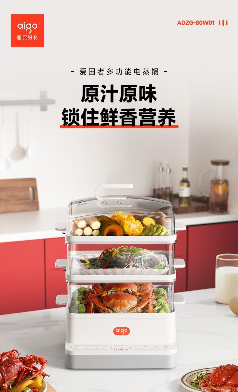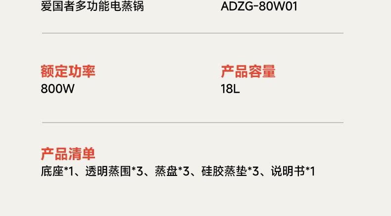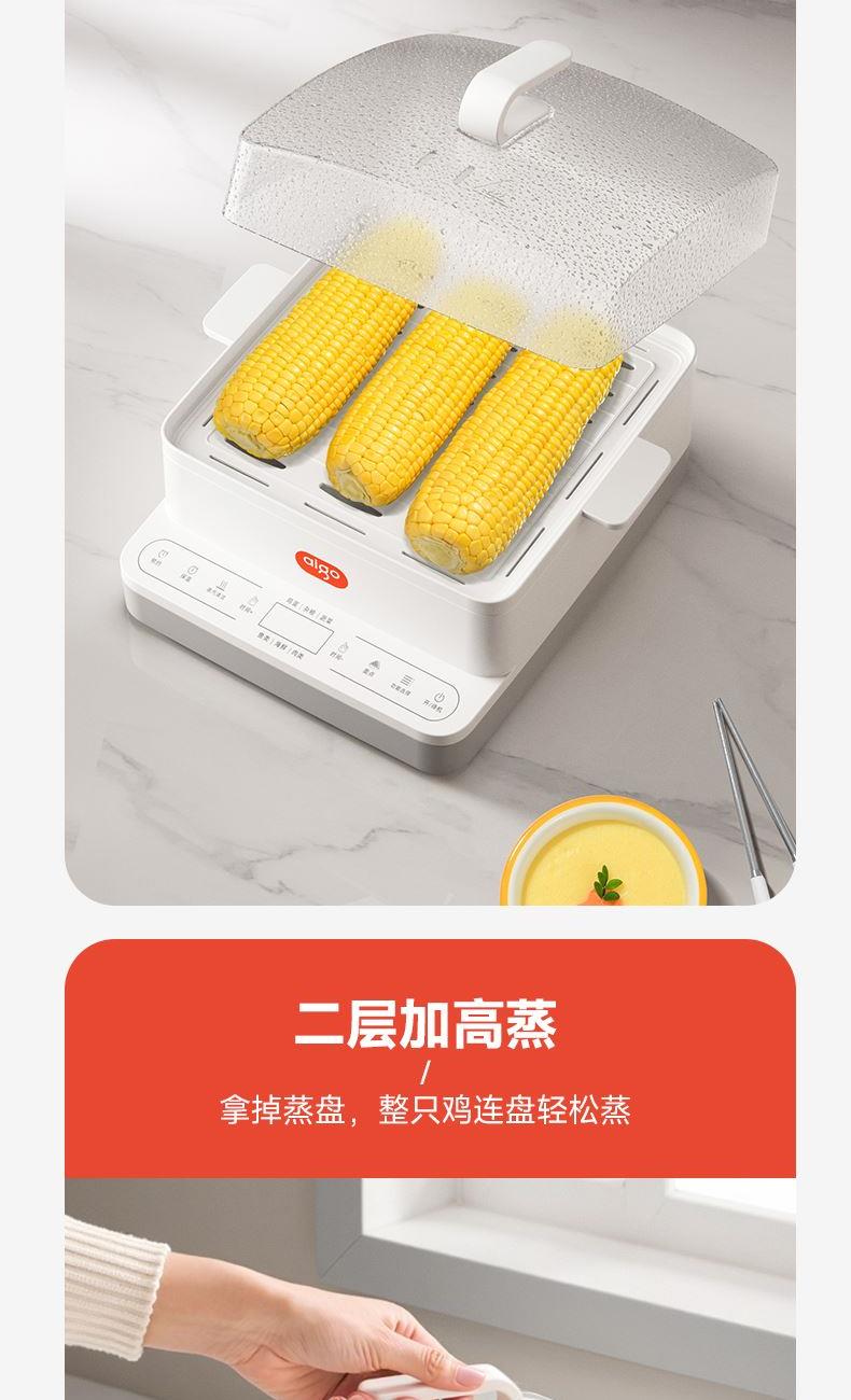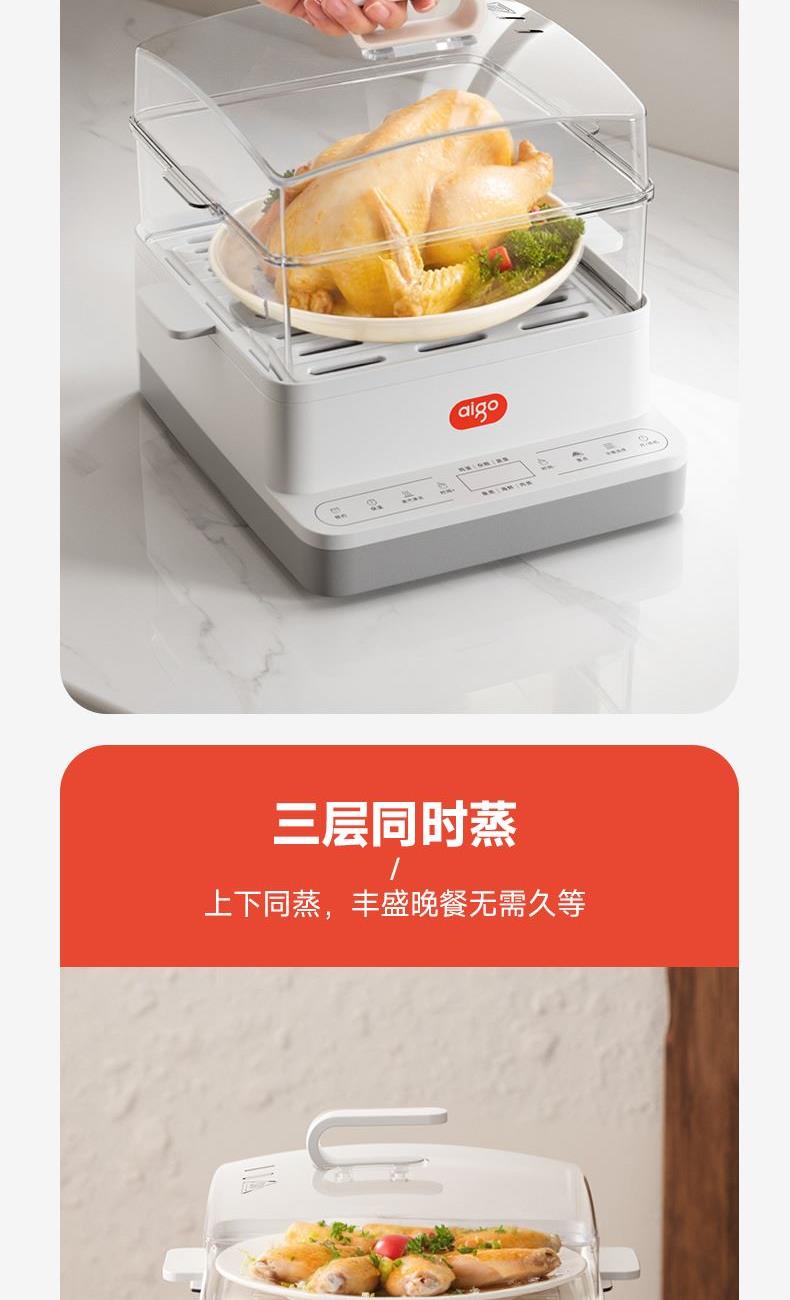 18L大容量,满足全家蒸煮需要 三层空间自由分配,满足更多烹饪需求 800W大功率立体蒸汽环流,均匀加热加热食材,呵护您的用餐安全 多种面板功能选择,预约、保温、定时、消毒样样精通 蒸汽除 菌功能,可对餐具高温消毒,让您吃得更安心、更放心 分体式设计,让清洁更简单 额定电压:220V 额定功率:800W 容量:18L 产品净含量:2.48kg 产品尺寸:306mm*308mm*410mm