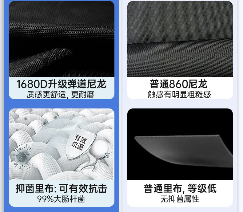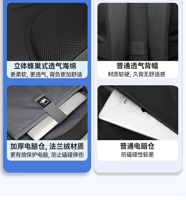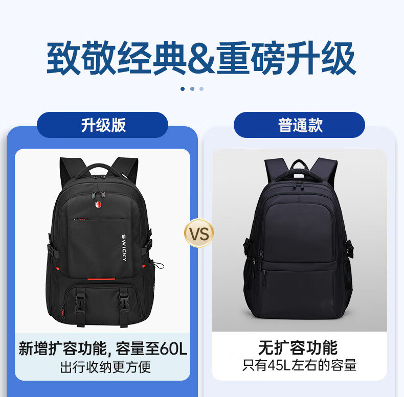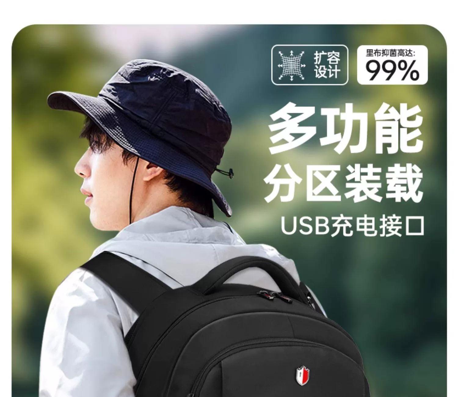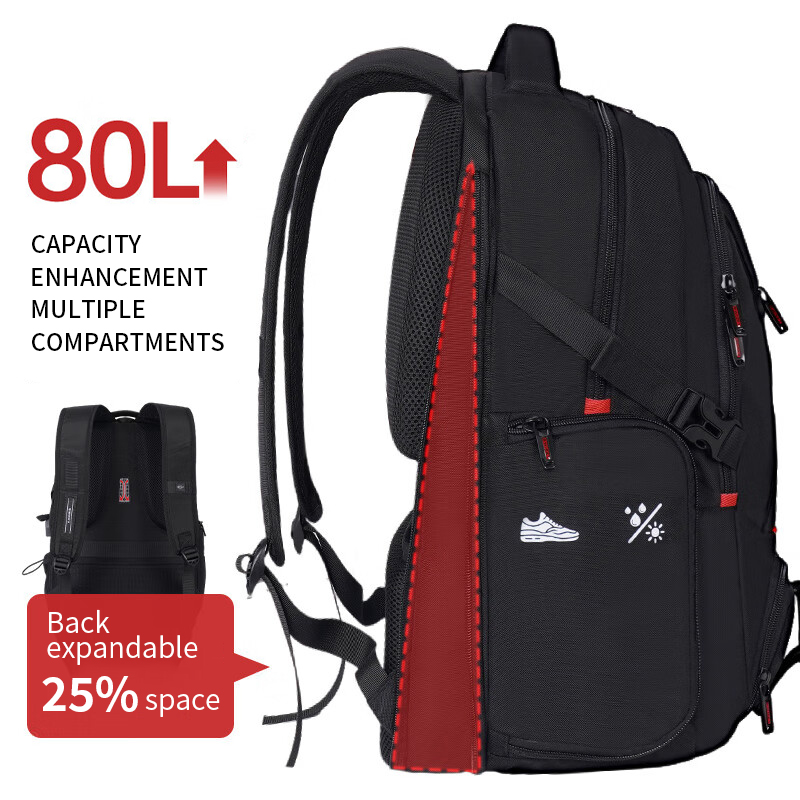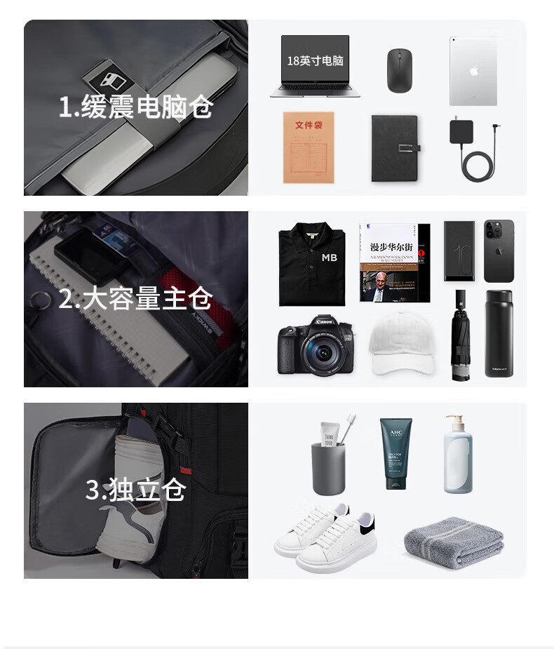 型 号: 88179黑色80L 尺 寸: 550*360*270 (MM) 材 质:织物 颜 色:黑色/蓝色/灰色 重 量:1.1KG -------------------------------- 描述: 大容量科学分层,收纳有序 创新扩容式设计,装的更多 防磨耐刮的面料,用的更久 防泼水易清洗面料,更易清理 加厚减震电脑仓,保护电脑 加厚透气减负肩带,久背不累