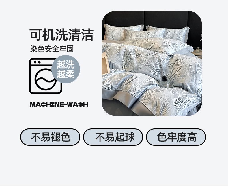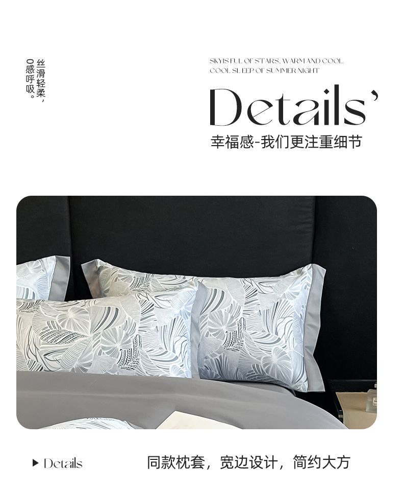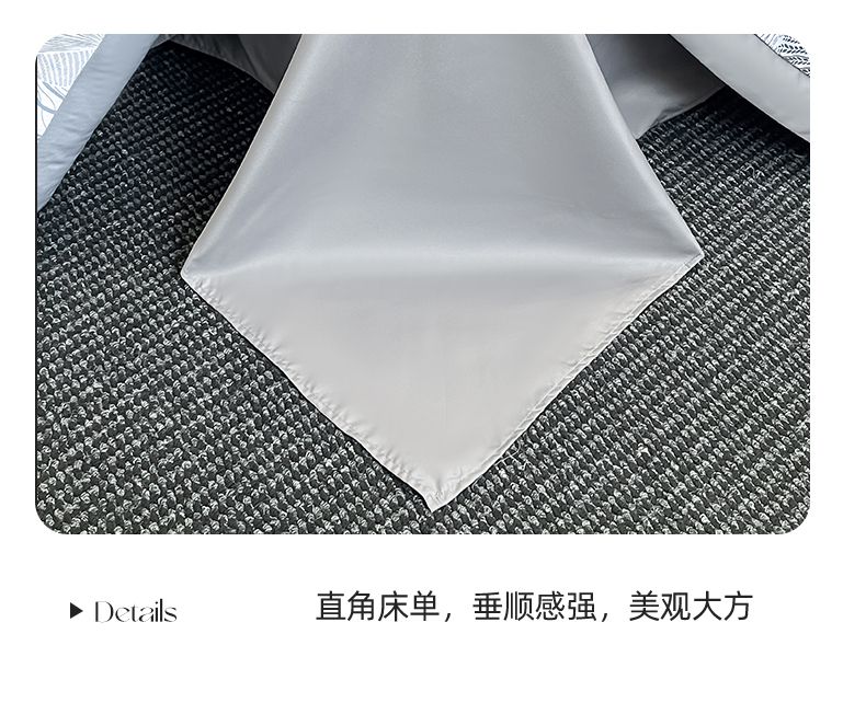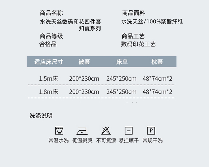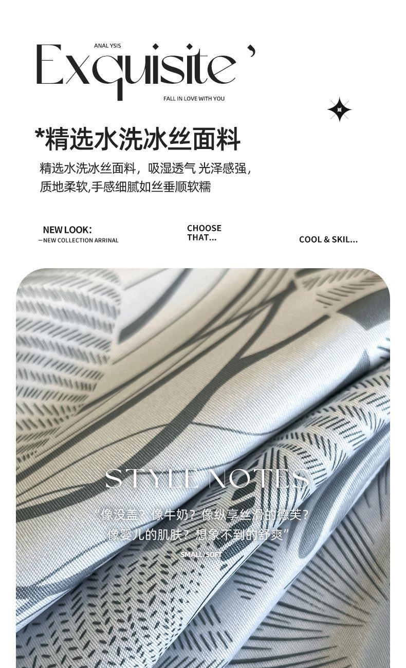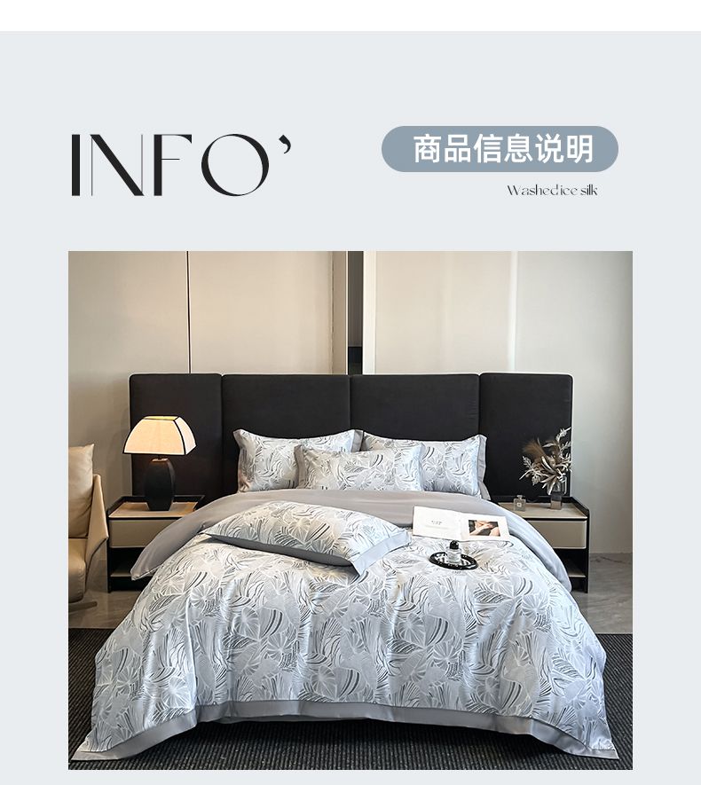 规格:被套200*230cm*1床单245*245cm*1枕套48x74cm*2 面料:聚酯纤维(水洗天丝) 花色:知夏-灰、知夏-宾利蓝、知夏-风信紫、知夏-奶咖 水洗天丝数码印花 AB版四件套系列 灵感并发 沉浸生活意趣 遇见轻奢生活之美 沉浸在清凉 之中 与优雅融为一体 有颜 好看 好睡 精选水洗冰丝面料 吸湿透气 光泽感强 质地柔软 手感细腻 如丝崔顺软糯 水洗天丝面料 快速吸收汗液 和水分 导湿快新能好 触感清爽 不粘腻 贴肤沁凉不冰 空调房也能使用 比普通平滑面料更透气 既平衡面料 质感 又拥有较好的透气性环保喷印 色牢度高 颜色靓丽 可水洗机洗 不易褪色 呵护品质生活