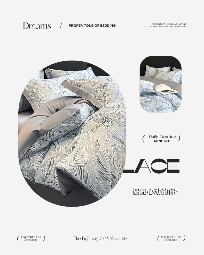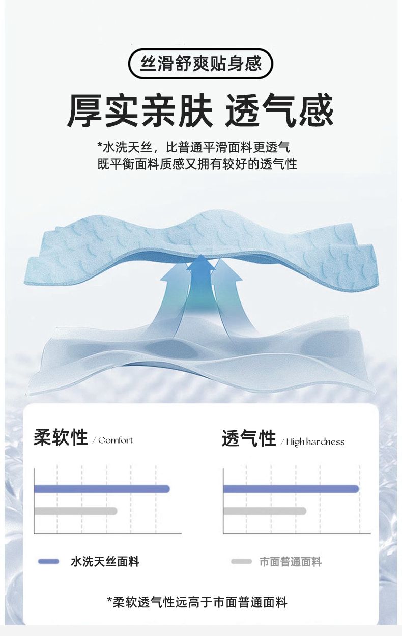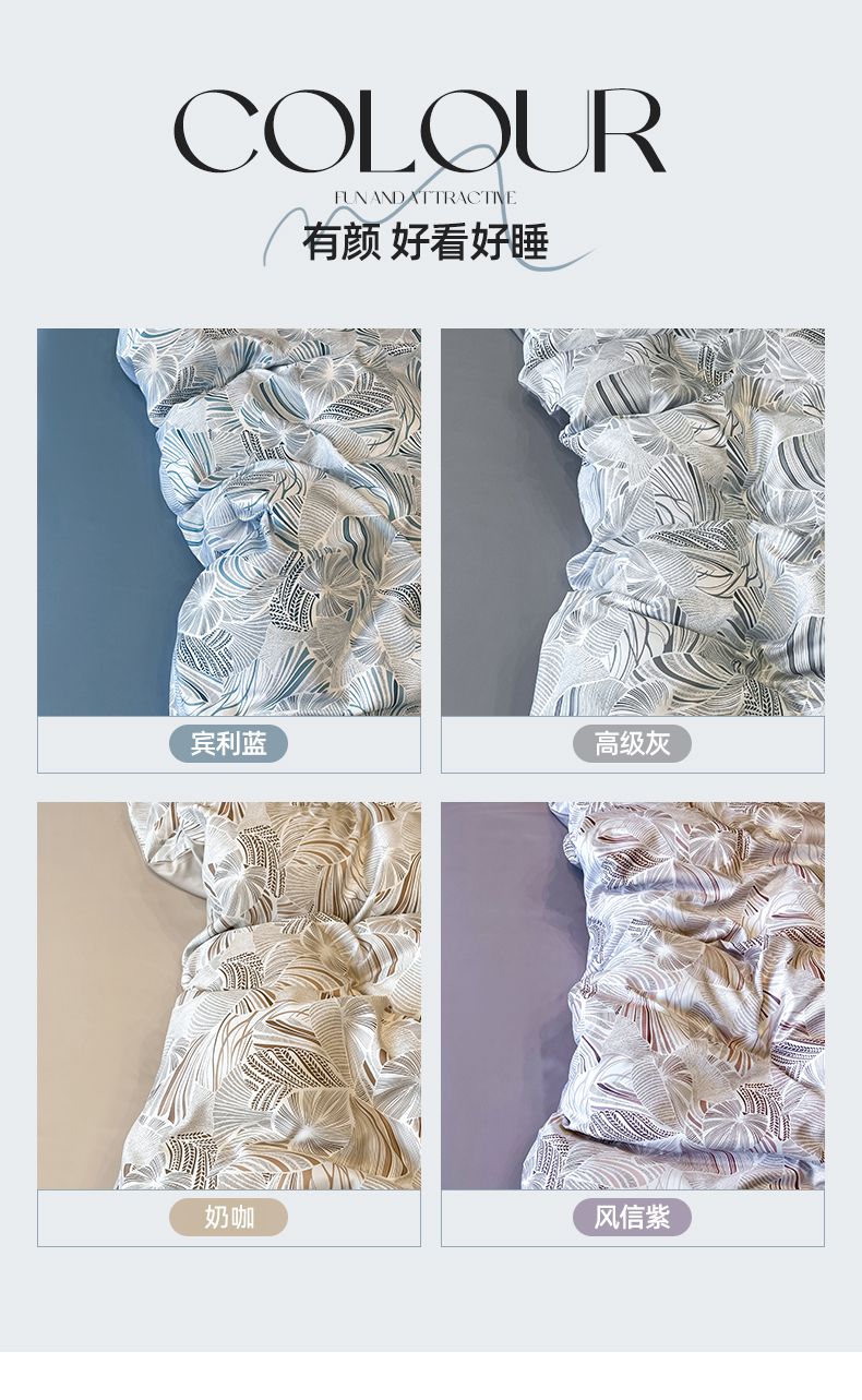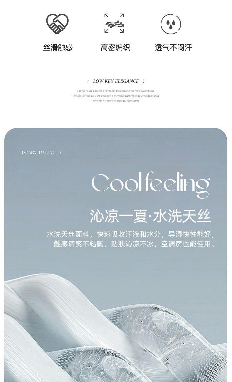 规格:被套200*230cm*1床单245*245cm*1枕套48x74cm*2 面料:聚酯纤维(水洗天丝) 花色:知夏-灰、知夏-宾利蓝、知夏-风信紫、知夏-奶咖 水洗天丝数码印花 AB版四件套系列 灵感并发 沉浸生活意趣 遇见轻奢生活之美 沉浸在清凉 之中 与优雅融为一体 有颜 好看 好睡 精选水洗冰丝面料 吸湿透气 光泽感强 质地柔软 手感细腻 如丝崔顺软糯 水洗天丝面料 快速吸收汗液 和水分 导湿快新能好 触感清爽 不粘腻 贴肤沁凉不冰 空调房也能使用 比普通平滑面料更透气 既平衡面料 质感 又拥有较好的透气性环保喷印 色牢度高 颜色靓丽 可水洗机洗 不易褪色 呵护品质生活