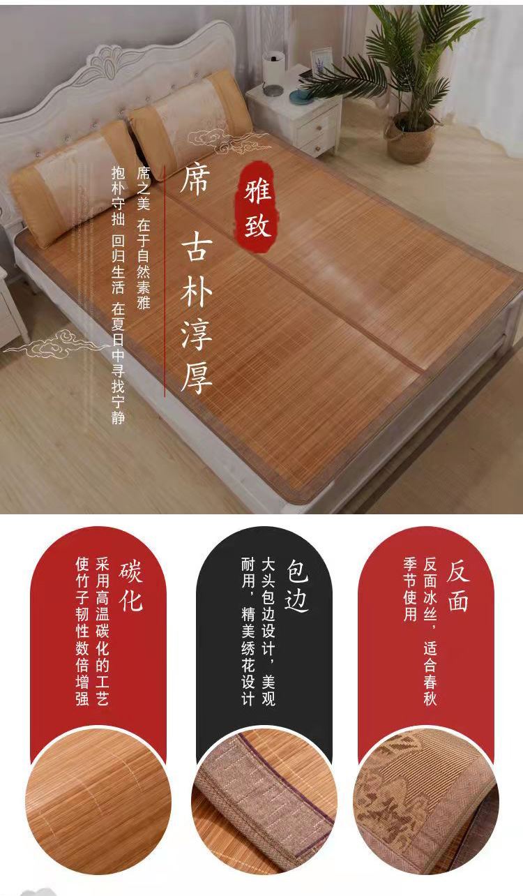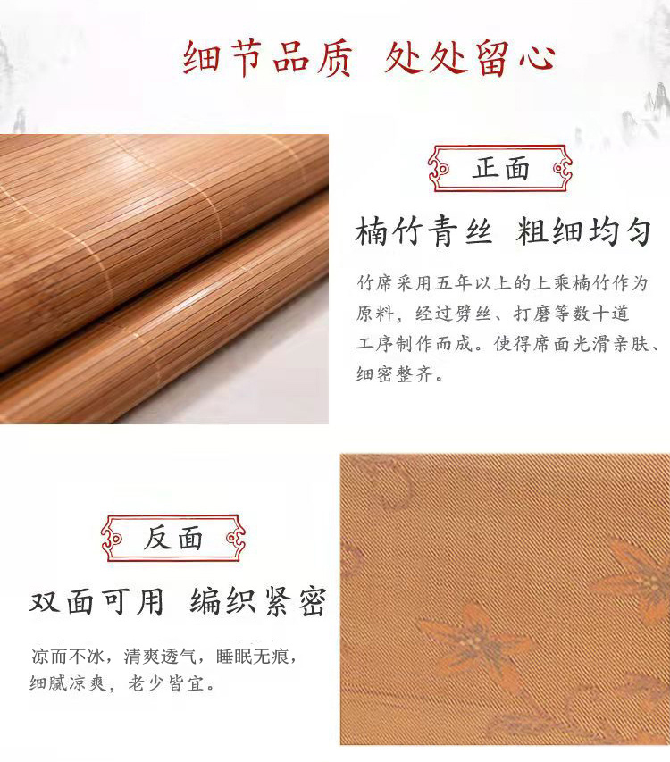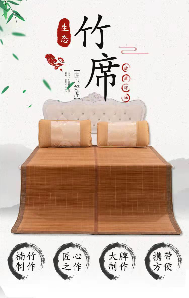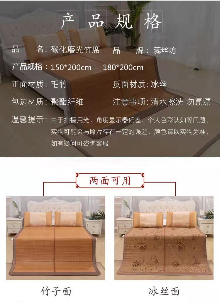 规 格:150*200cm 花 型:如图所示(不包含枕头) 材 质:竹丝 / 四周聚酯纤维包边 头层老竹,坚韧耐用,更清凉,反面仿藤面料,双面可用。初次使用须拿毛巾擦洗干净,不可水洗暴晒,不用时,擦净后 晾干,按照中间折叠线将竹席面朝外合拢后对折再卷起,置于干燥通风处。