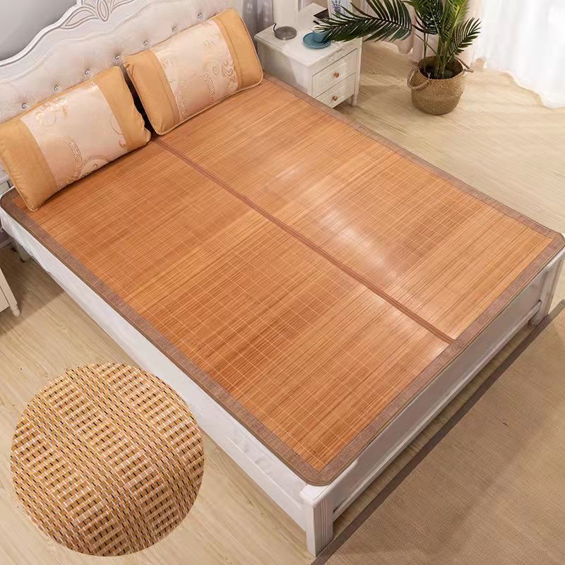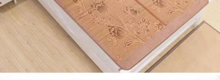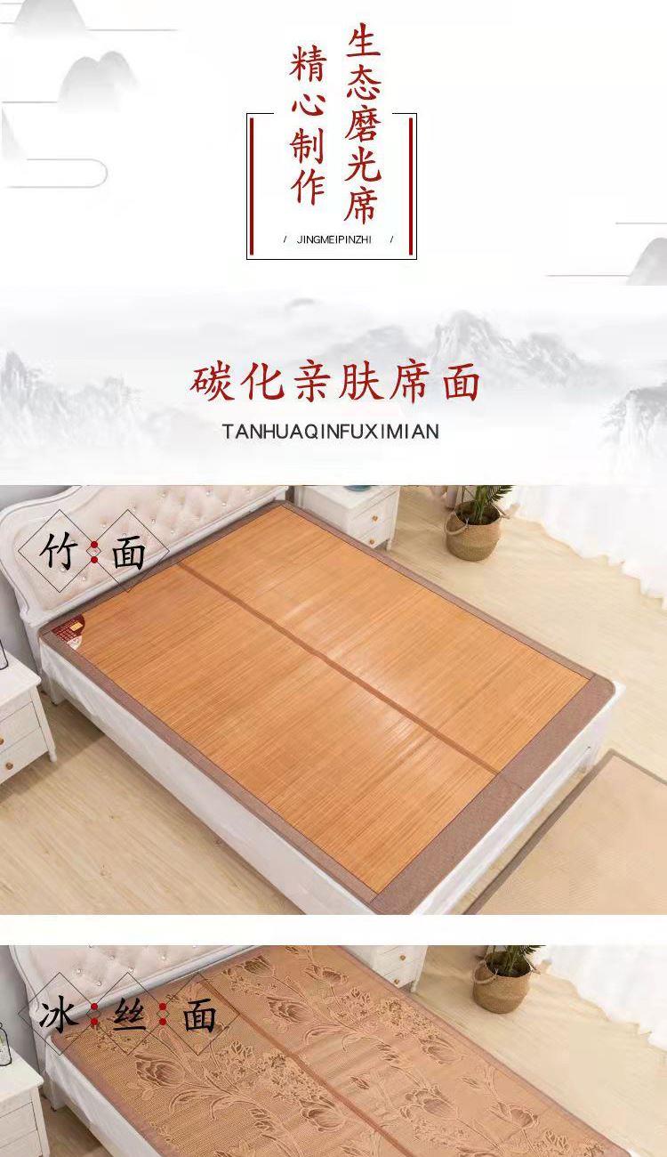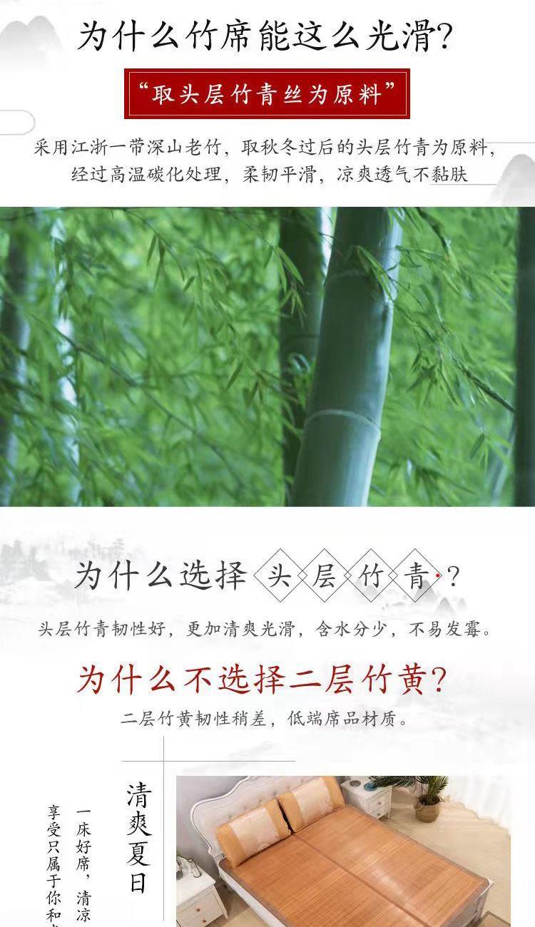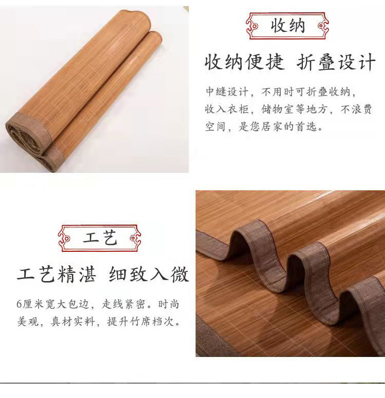规 格:150*200cm 花 型:如图所示(不包含枕头) 材 质:竹丝 / 四周聚酯纤维包边 头层老竹,坚韧耐用,更清凉,反面仿藤面料,双面可用。初次使用须拿毛巾擦洗干净,不可水洗暴晒,不用时,擦净后 晾干,按照中间折叠线将竹席面朝外合拢后对折再卷起,置于干燥通风处。