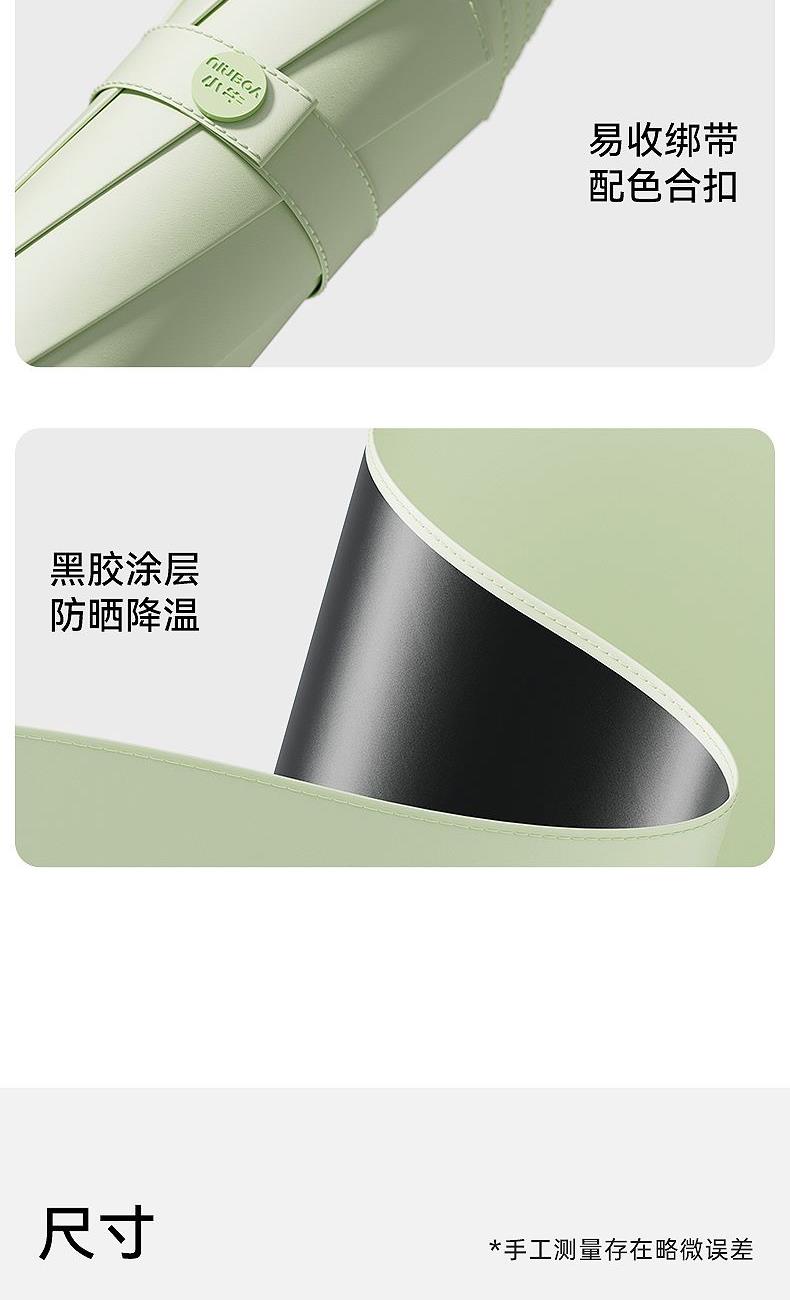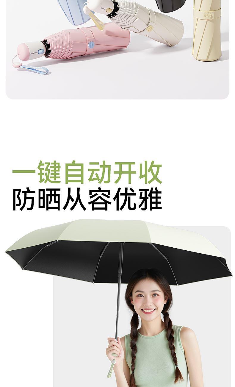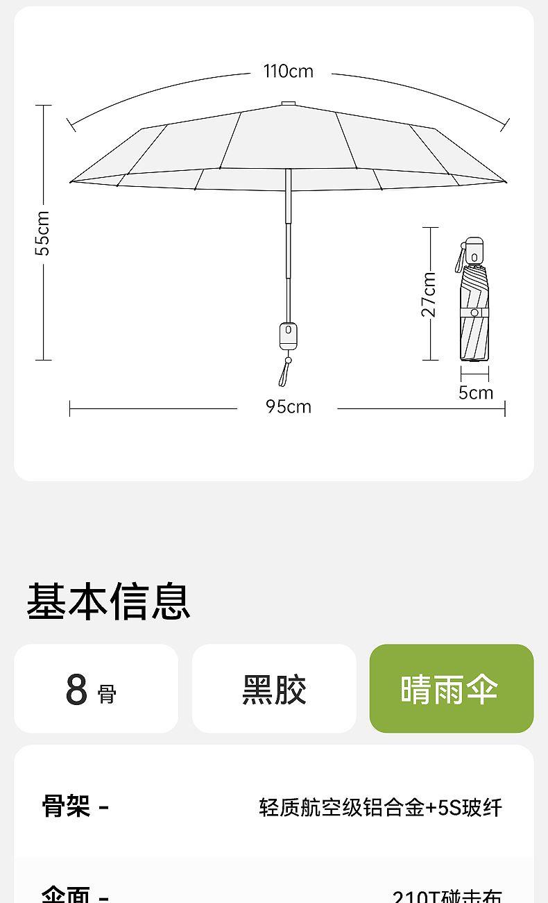 商品货号:ZD2572 伞架材质:铝合金,玻纤 伞面材质:210T全遮光黑胶 款式:自动三折8骨安全式 商品参数:伞下直径:98cm 高度:55cm 收拢宽度径:5cm 收拢高度:27cm 商品毛重:360克 商品颜色: ZD2572-米白色 ZD2572-珊瑚粉 ZD2572-星空黑 ZD2572-柠檬黄 ZD2572-碎冰蓝 ZD2572-浅草绿 ZD2572-冷雾紫