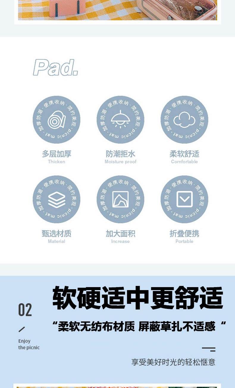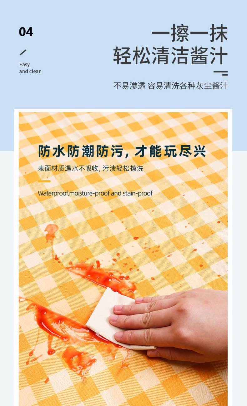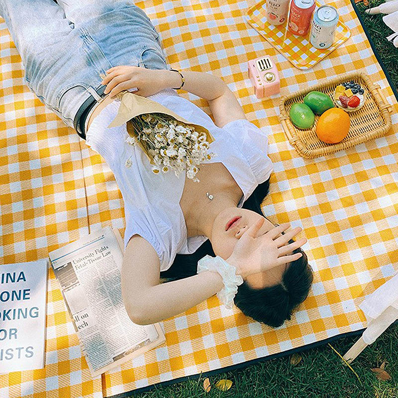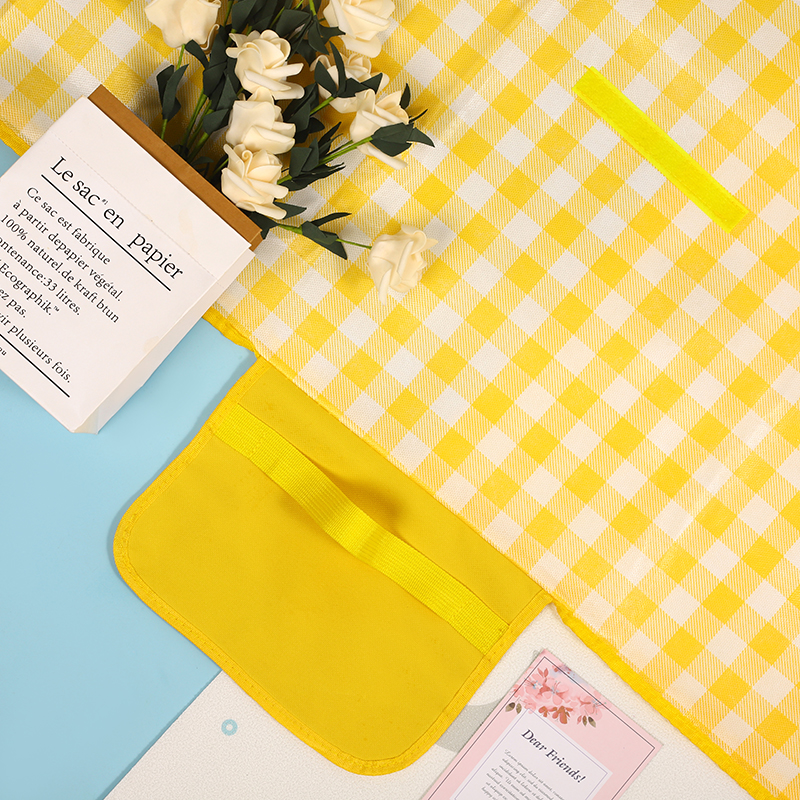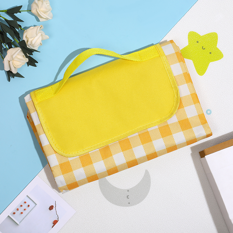 配 置:野餐垫*1 产品颜色:黄色方格 产品材质:600D牛津布 产品尺寸:200*200CM 包 装:OPP袋 产品卖点: 1、便携折叠易收纳。 2、防潮耐磨,小巧便捷,不沾花草